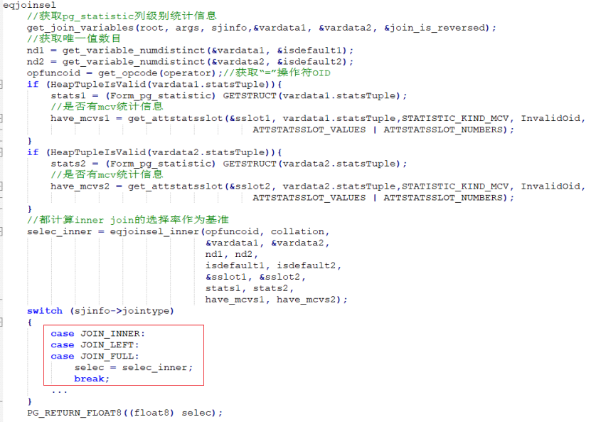 对于eqjoinsel来说利用MCV、等品直方图等统计信息来计算选择率,我们看下计算逻辑: