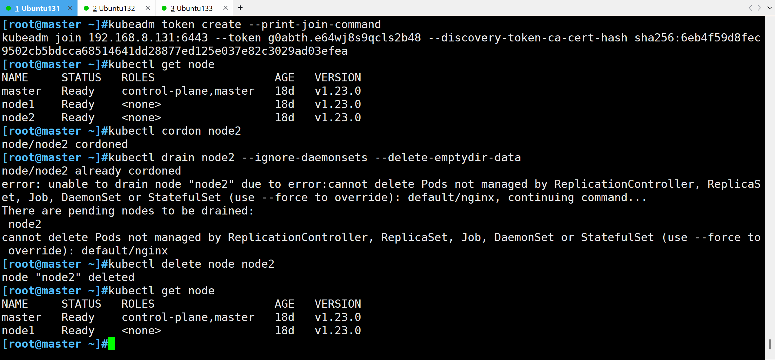 inikubectl drain node2 --ignore-daemonsets --delete-emptydir-data- 从Master节点中删除节点记录