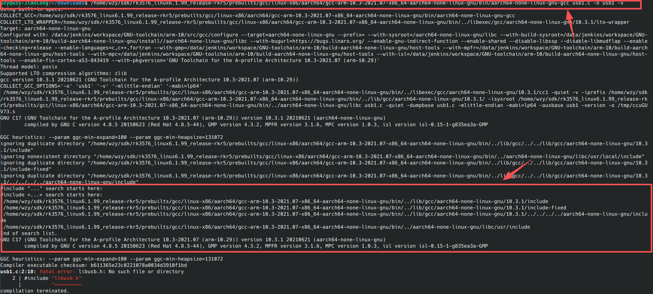 这里可以看见上面所讲的交叉编译工具的头文件系统路径,同时也报出一个错误,无法找到libusb.h文件,因为我没有吧对应头文件拷贝到红框中的任何一个头文件路径中去,也没有通过-I命令手动指定。接下来我将通过手动指定的方式来展示加了这个选项之后的变化。