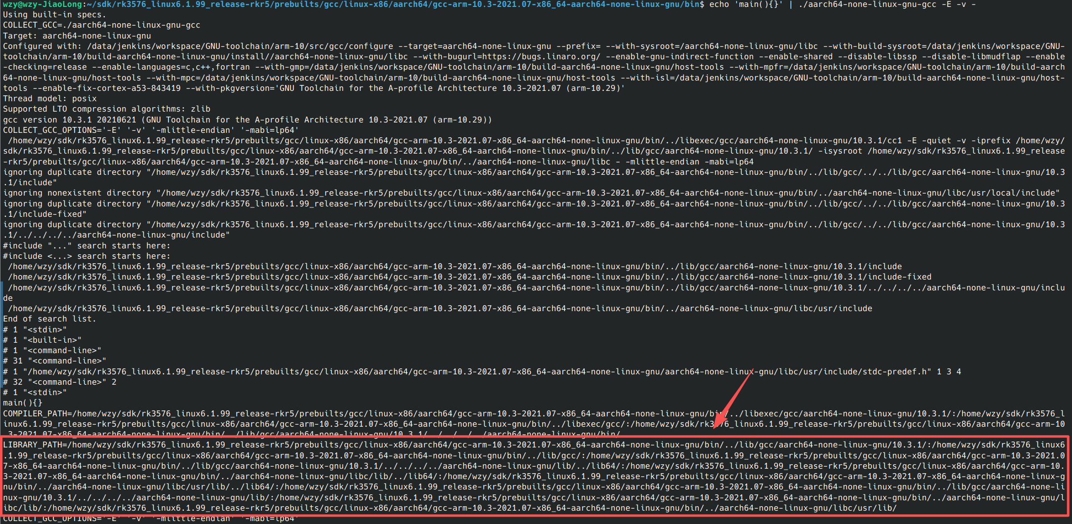 可以看到红框部分打印出了LIBRARY_PATH这个宏,这个宏就表示的是交叉编译工具在链接时,会到这些路径下去查找库文件,当我们缺少库文件时,可以将库文件拷贝到这些目录下的任意一个路径就行,同样我们也可以自己指定链接库的路径,链接时用-L<path>选项指定,编译时,编译器会优先使用通过-L指定的路径