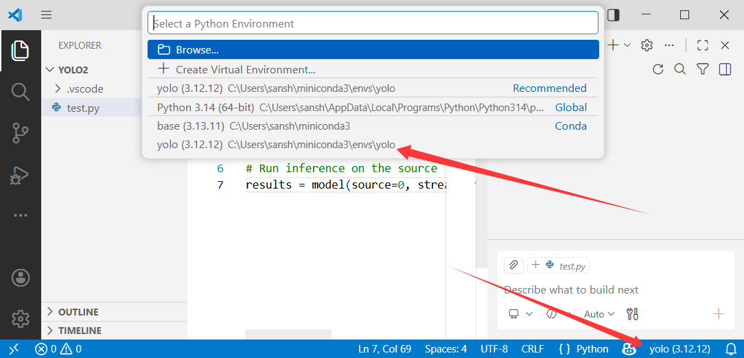 创建一个叫yolo的,python版本为3.12的虚拟环境。(基于2026年2月的情况,我推荐使用python3.12,因为这是后面库支持的最高版本,如果你是在27年或者更未来看到的话,建议根据后面的库的文档中建议的最高python版本创建)