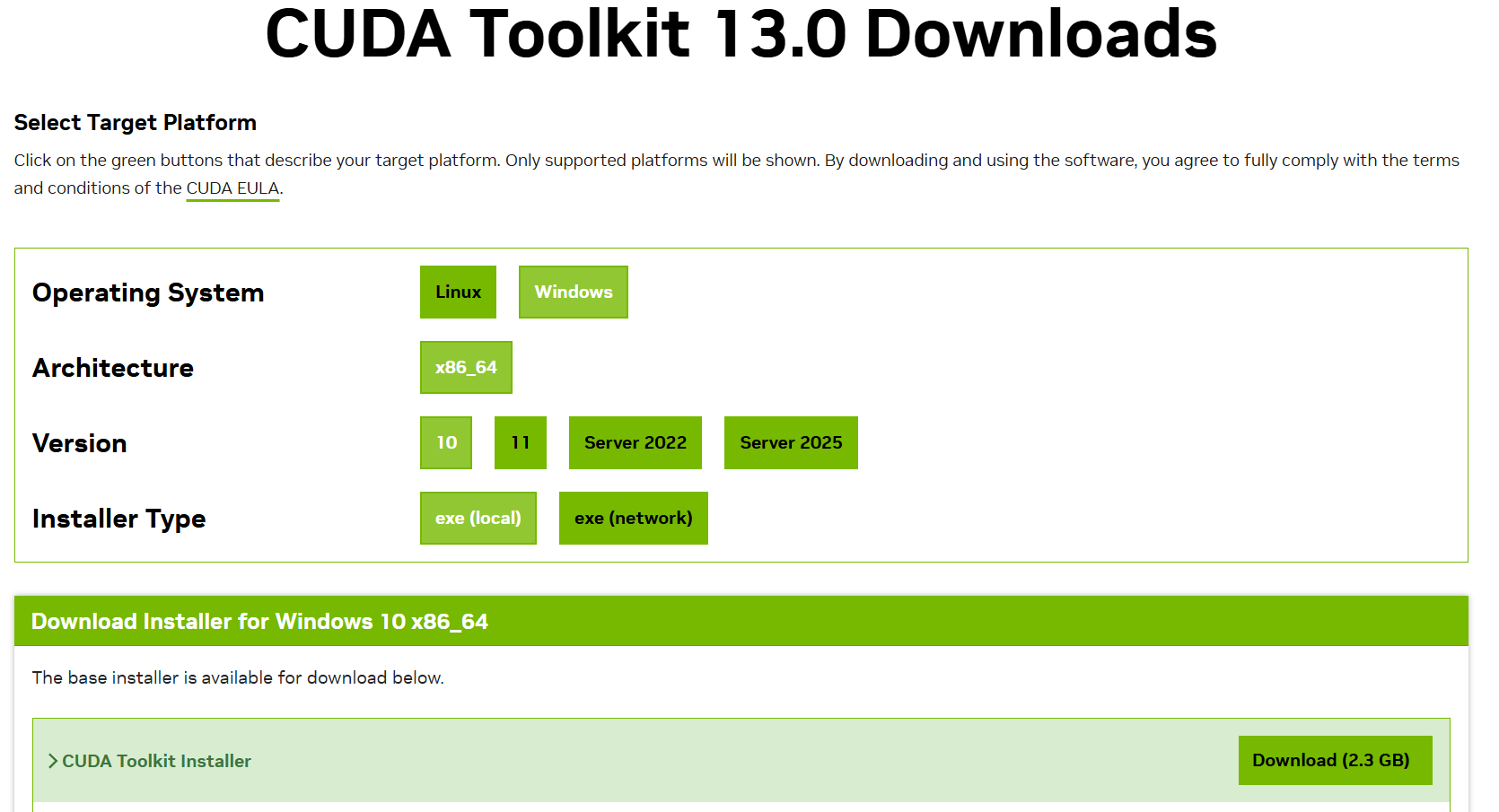 因为我的最高支持版本是CUDA Version: 13.1,并且PyTorch的库的最高支持版本是13.0,所以这里我选择13.0版本安装。