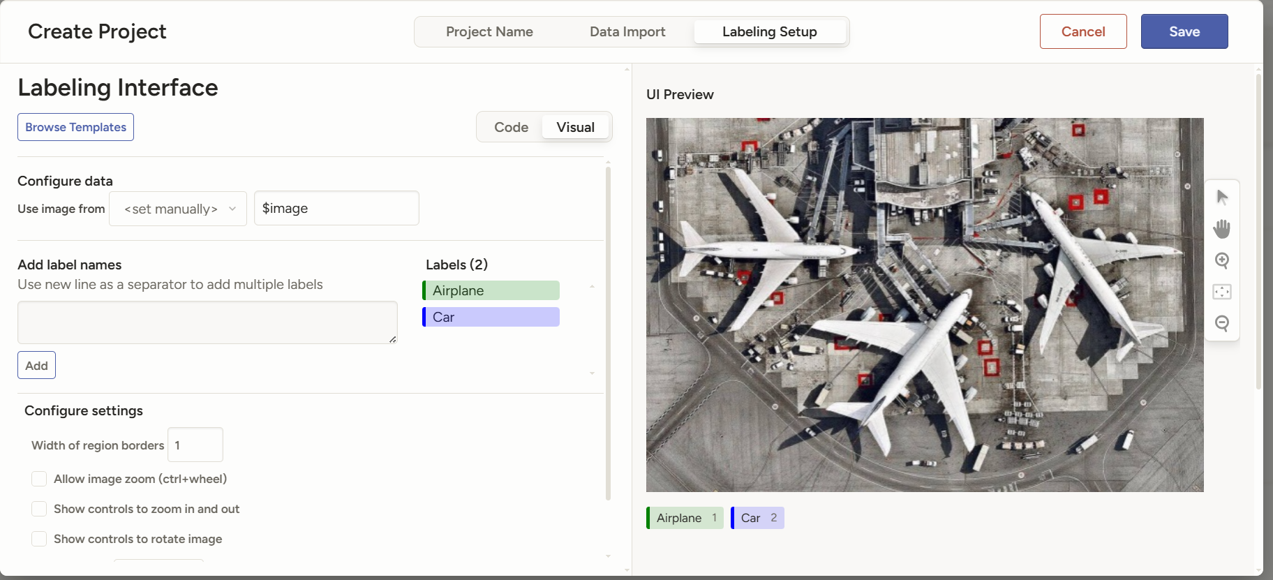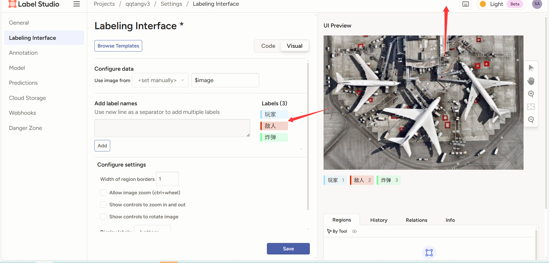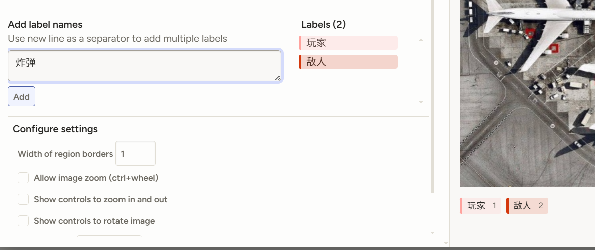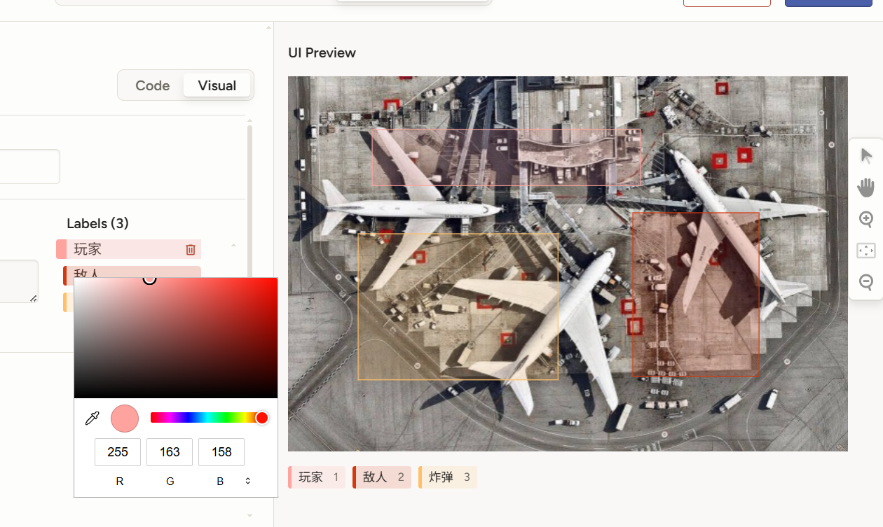 点中之后,会让你填写标签,它默认的示例是车辆和飞机,以及一张测试图片,你可以在右侧拉框框测试颜色。