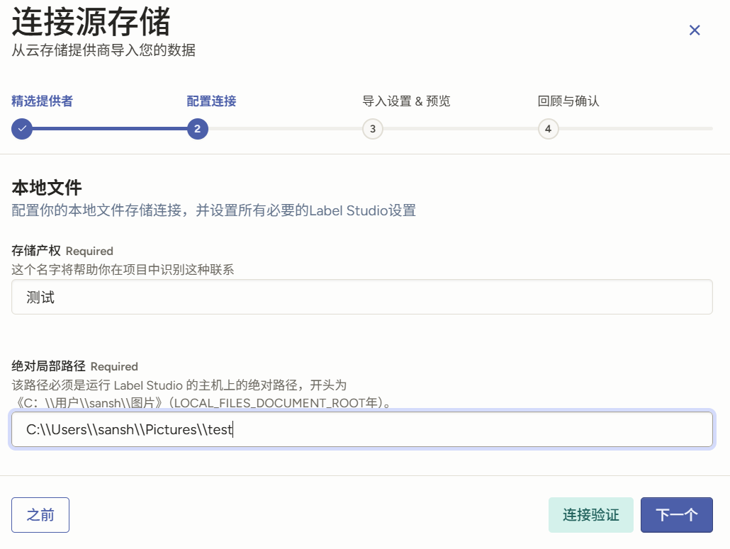 然后在这里填入你数据集的目录,然后点击测试,测试通过的话,就点next。(如果环境变量没有设置好的话,你会看到一个红框,并提示你去设置。)