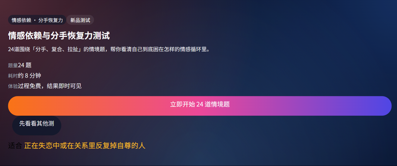 它只是一份产品介绍:我做了一个「情感依赖与分手恢复力测试」,希望用更温和、具体的方式,帮你看清关系里的拉扯模式,以及走出来的现实路径。