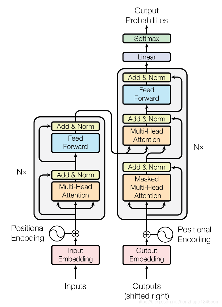 编码器由N个相同层堆叠(通常N=6),每次包含两个核心子层:
