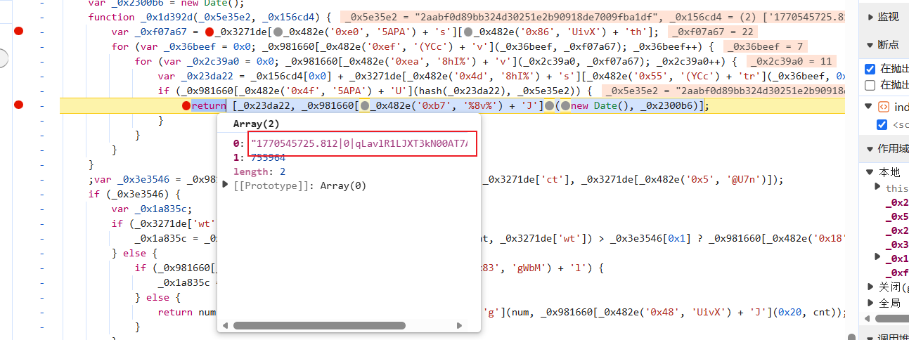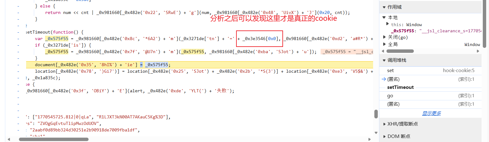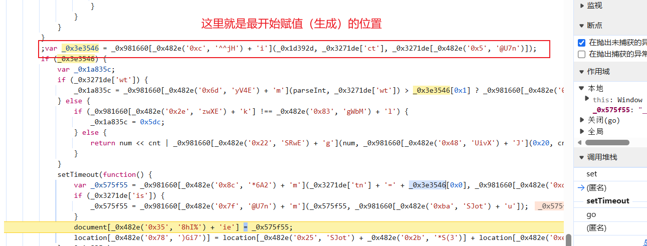我们清除cookie后打开脚本断点,然后进入到第二次请求得到js代码的地方:
