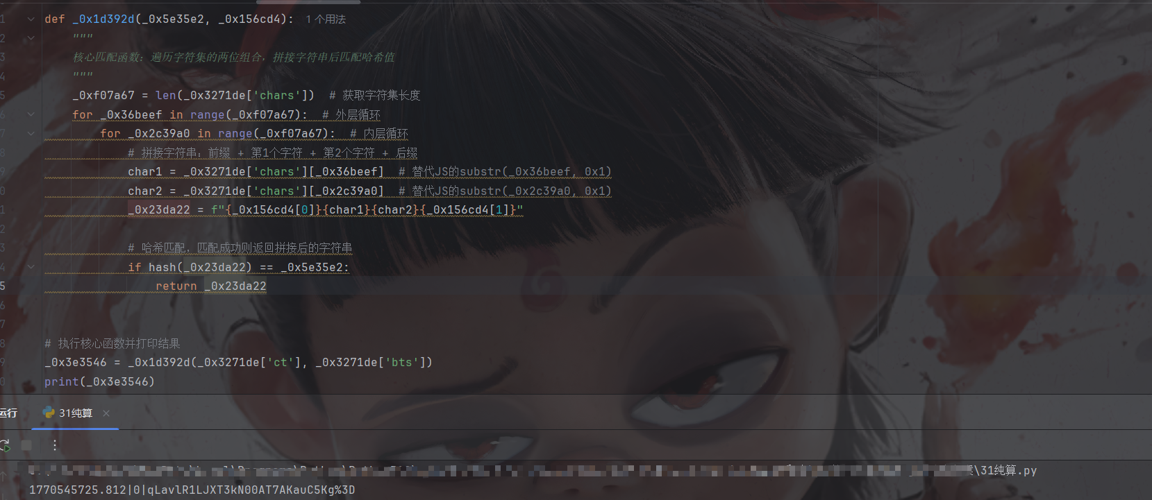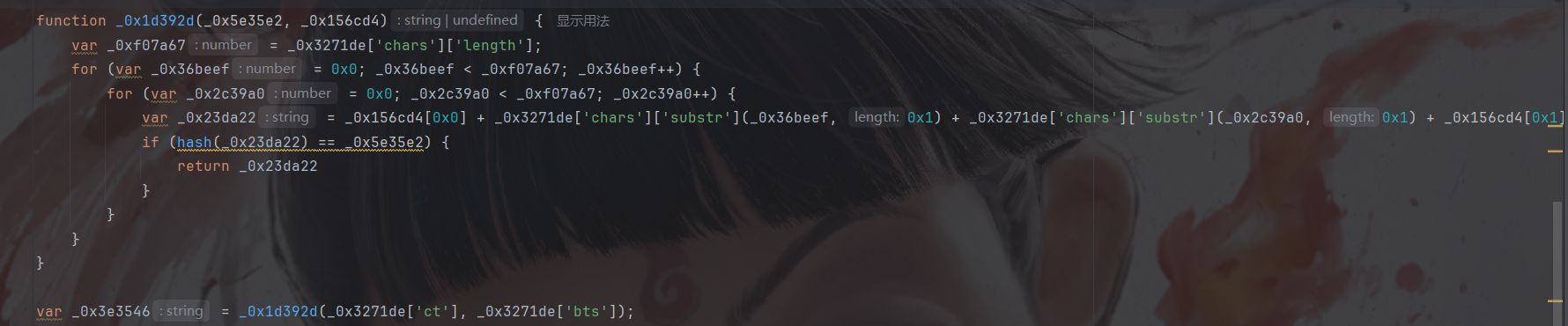 往里面一点一点跟,你会发现for循环遍历的次数是go入参的chars键的值的长度,然后通过循环取出chars的值里的字符来拼接到第二个入参两字符串中间,然后通过go入参规定的hash算法加密后和第一个入参对比,一样后停止循环然后得到cookie: