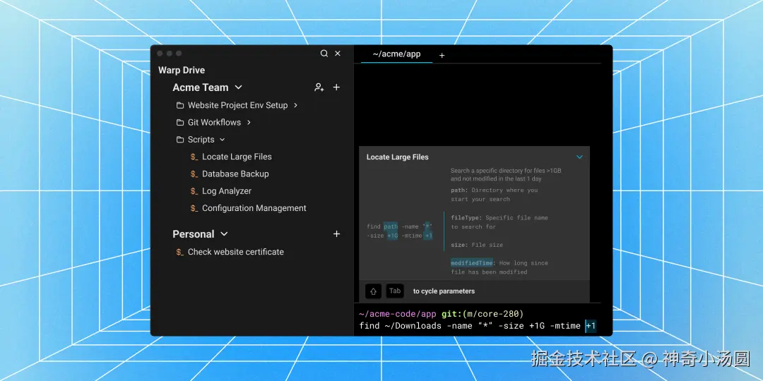 Warp Drive 相当于终端里的"云端工作区"。你可以将复杂的部署指令或环境初始化脚本存入云端,全组共享。