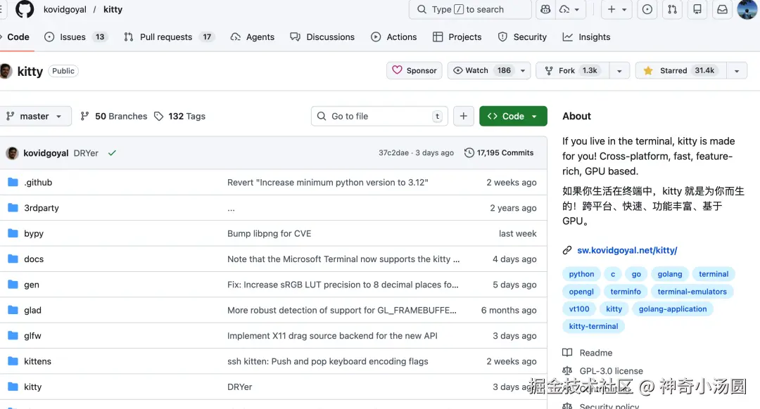 kitty 是老牌的 GPU 加速终端,用 C 语言编写,追求"快速、功能强大、高度可定制"。