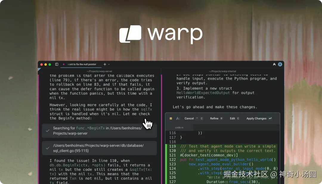Warp 原生内置了 AI 助手,不再需要开发者在浏览器和终端之间来回切换: