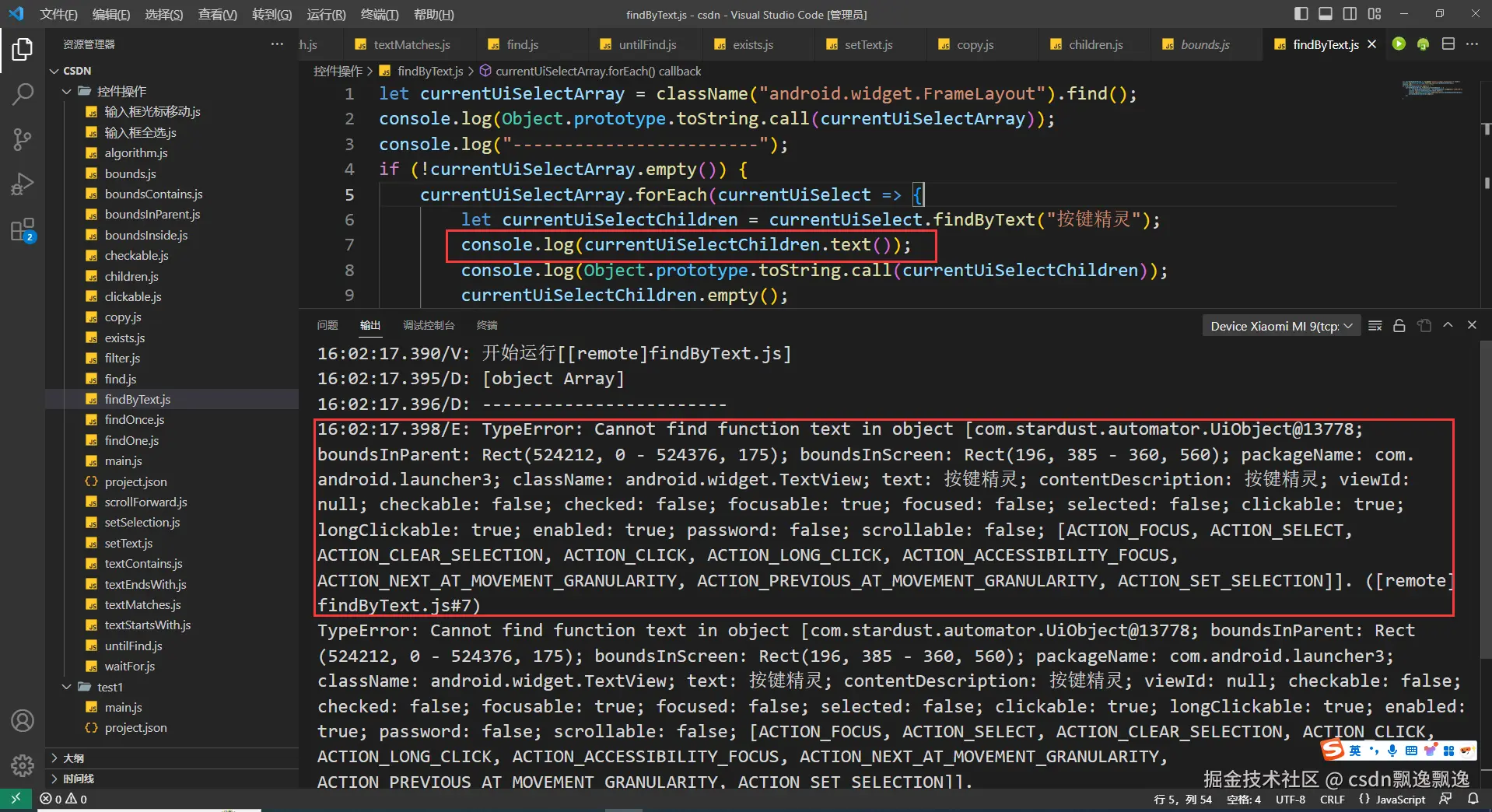此函数谨慎使用,按照官方文档说明,会返回控件数组,实际上返回数据类型有问题,导致这个函数容易出现奇奇怪怪的问题。find函数会返回控件数据,正常来说findByText函数应该也会返回控件数组,因此两者返回类型应该是一致的。但是通过测试发现,两者返回类型不一致,同时调用控件数组常用判断数组是否为空的empty函数,直接报错。
