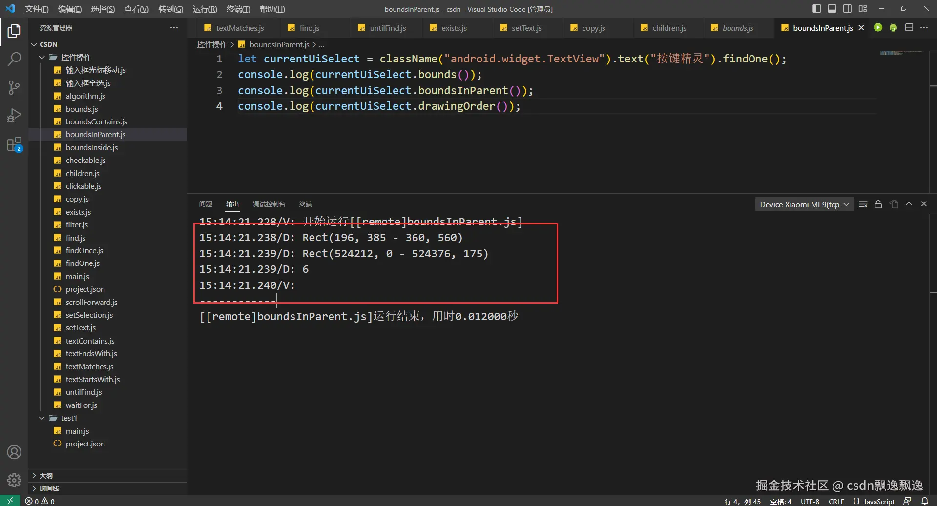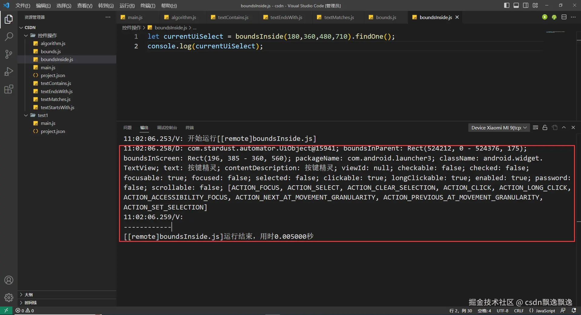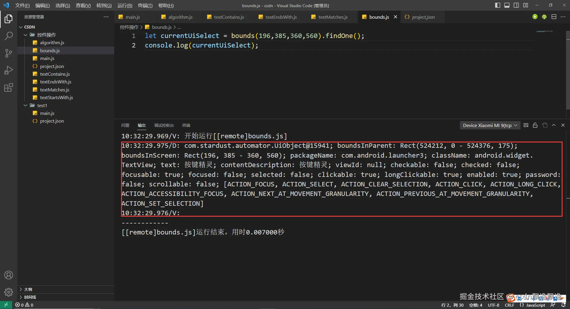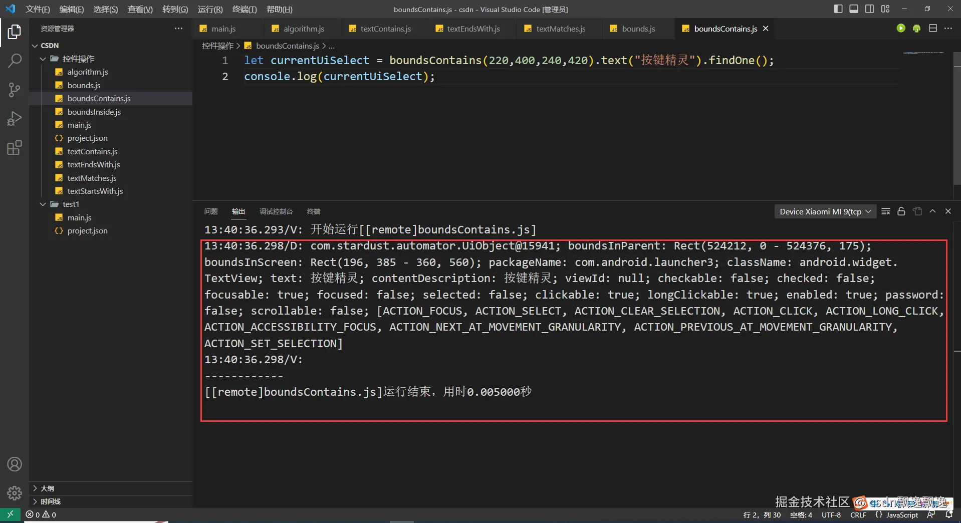 有细心的好伙伴已经发现,这次测试boundsContains函数功能为什么附加上text选择器,因为这个控件有可能出现重叠情况,我又值查找一个数据,所以加上text选择器是为了证明这个函数的作用。因为父控件一定包含子控件,在子控件的范围也一定在父控件的位置,也就是说找个位置,根节点控件都有可能被找到。因此,boundsContains函数最好和其他控件选择器配合使用。