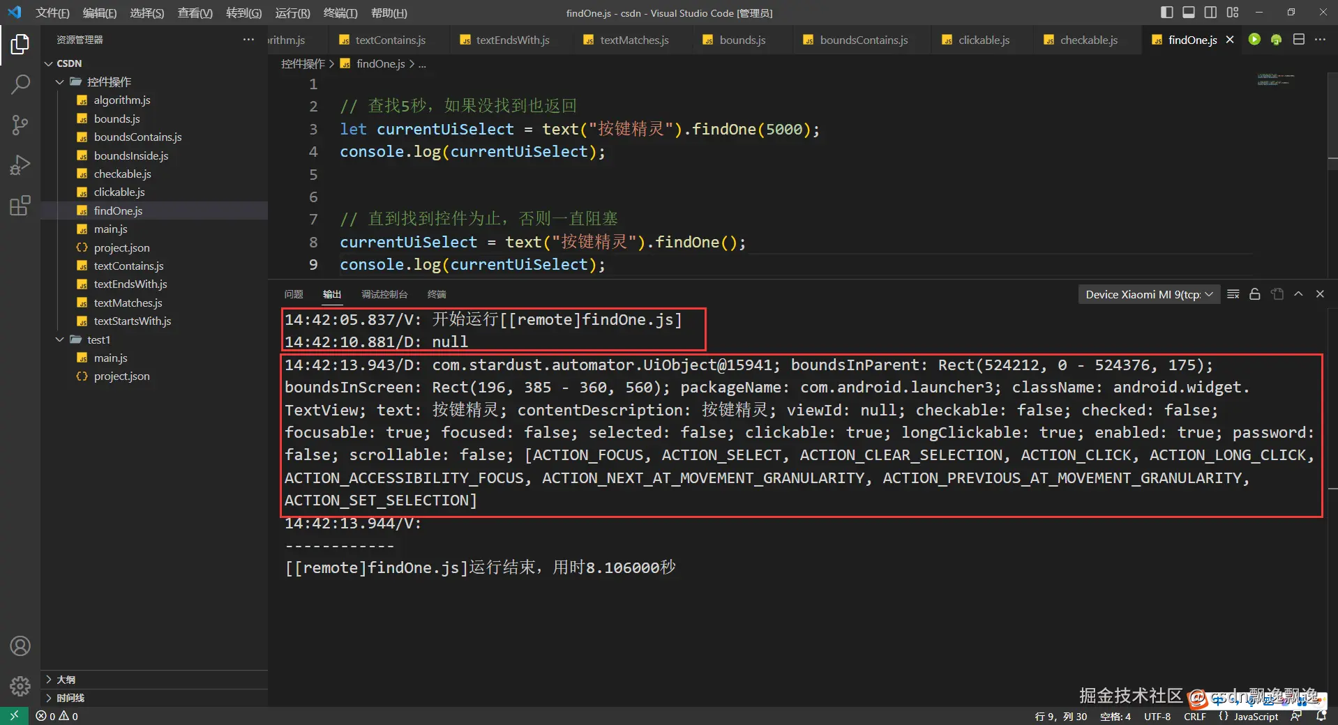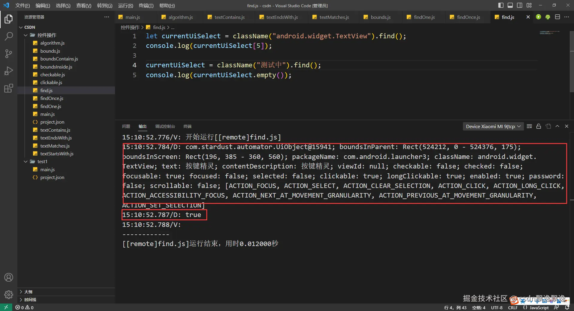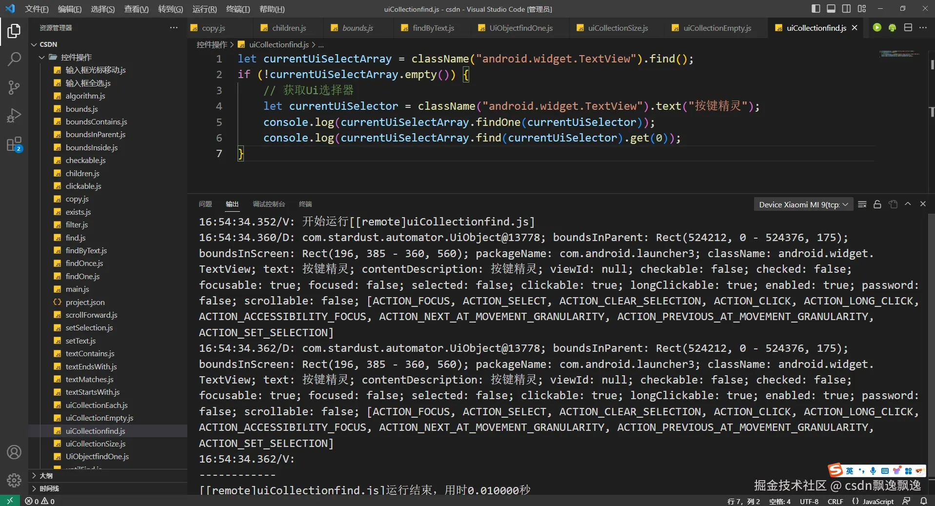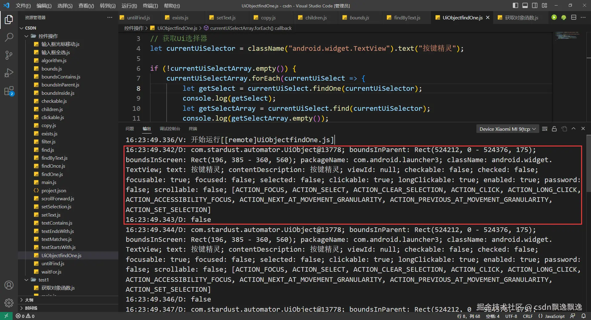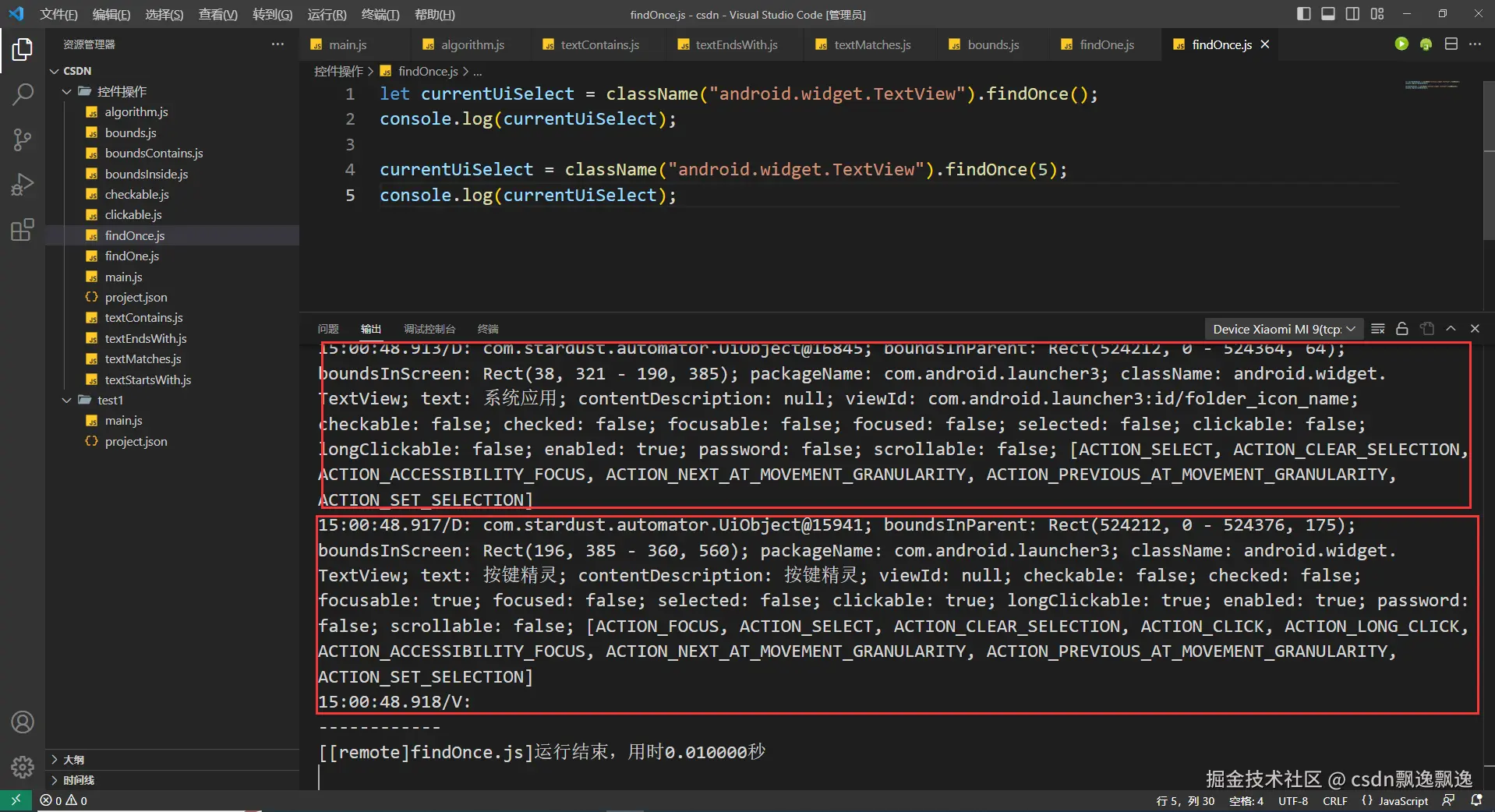 有细心的好伙伴已经发现,这次测试boundsContains函数功能为什么附加上text选择器,因为这个控件有可能出现重叠情况,我又值查找一个数据,所以加上text选择器是为了证明这个函数的作用。因为父控件一定包含子控件,在子控件的范围也一定在父控件的位置,也就是说找个位置,根节点控件都有可能被找到。因此,boundsContains函数最好和其他控件选择器配合使用。