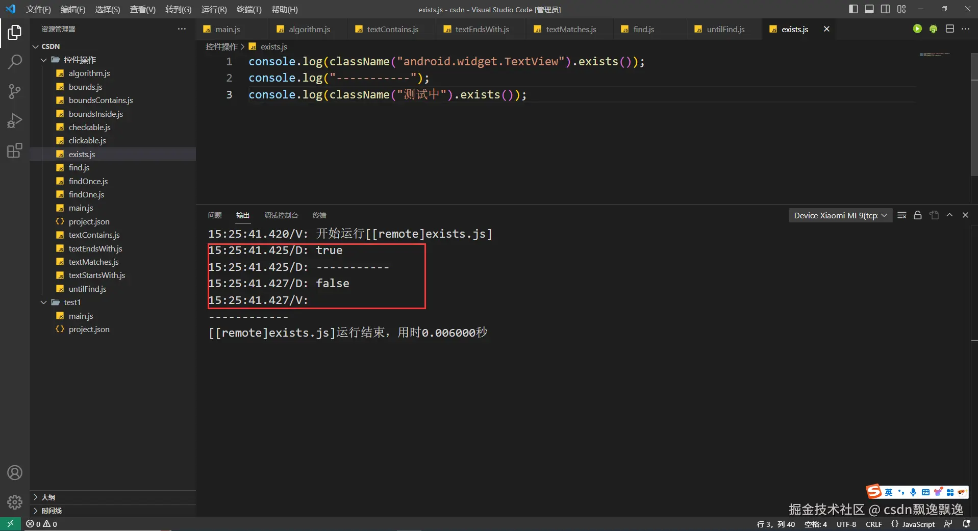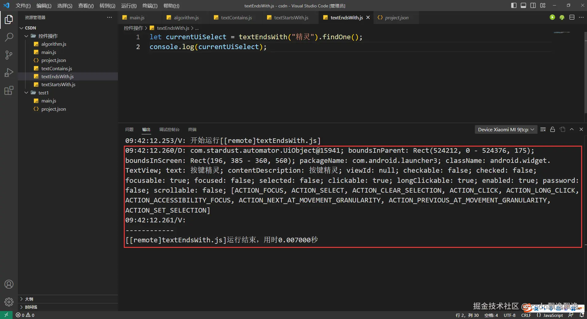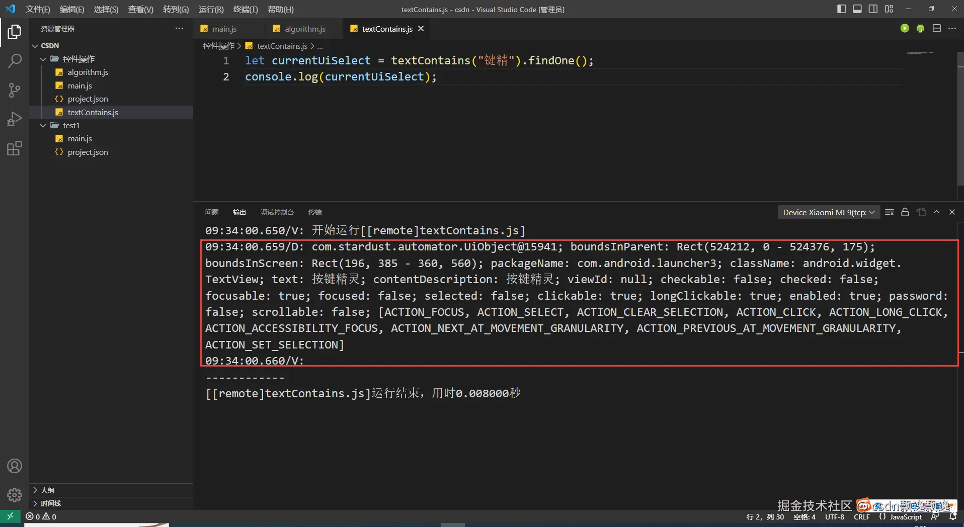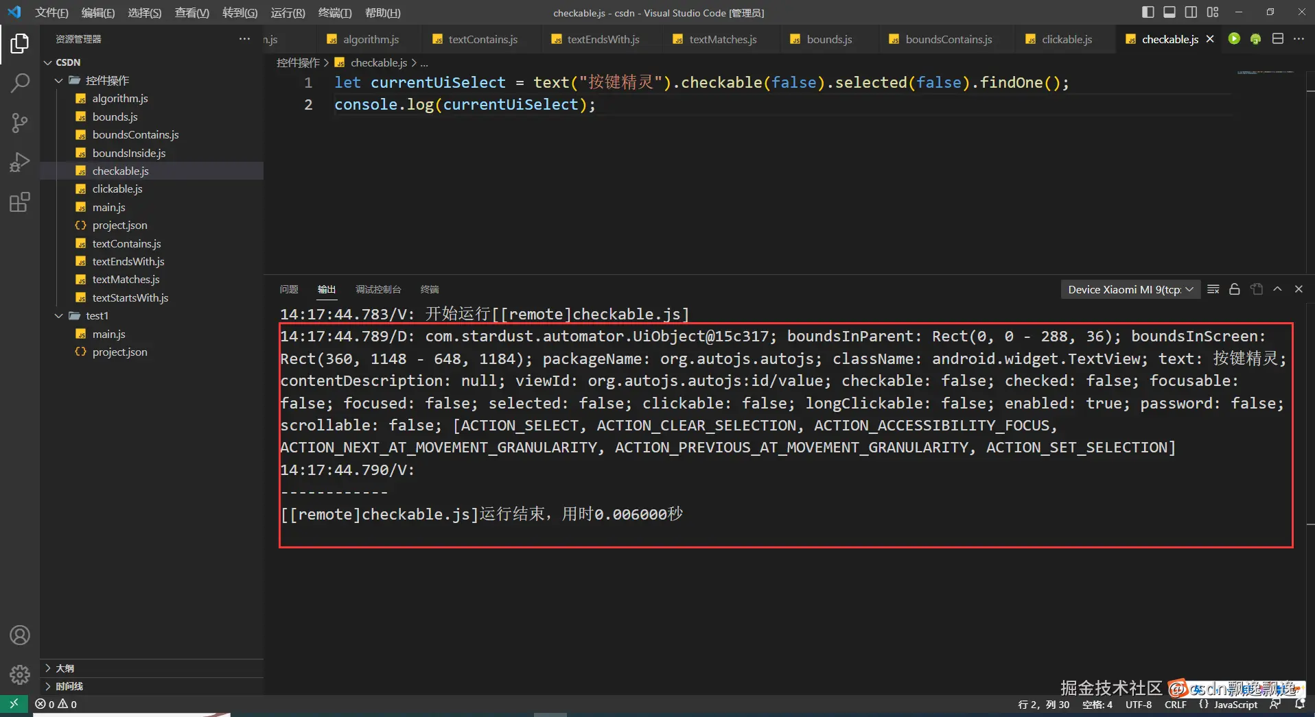 有细心的好伙伴已经发现,这次测试boundsContains函数功能为什么附加上text选择器,因为这个控件有可能出现重叠情况,我又值查找一个数据,所以加上text选择器是为了证明这个函数的作用。因为父控件一定包含子控件,在子控件的范围也一定在父控件的位置,也就是说找个位置,根节点控件都有可能被找到。因此,boundsContains函数最好和其他控件选择器配合使用。