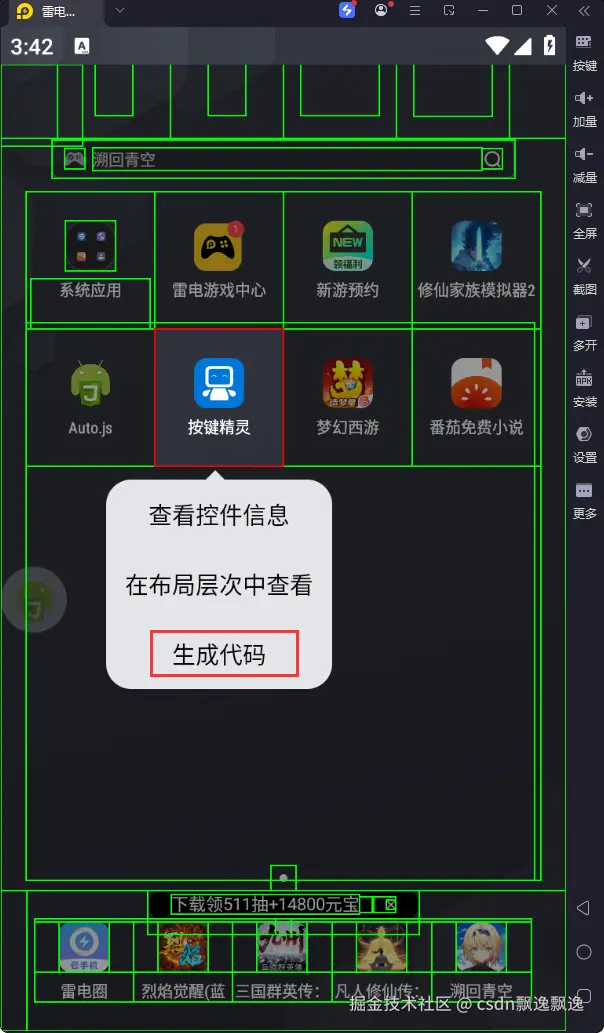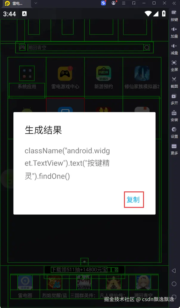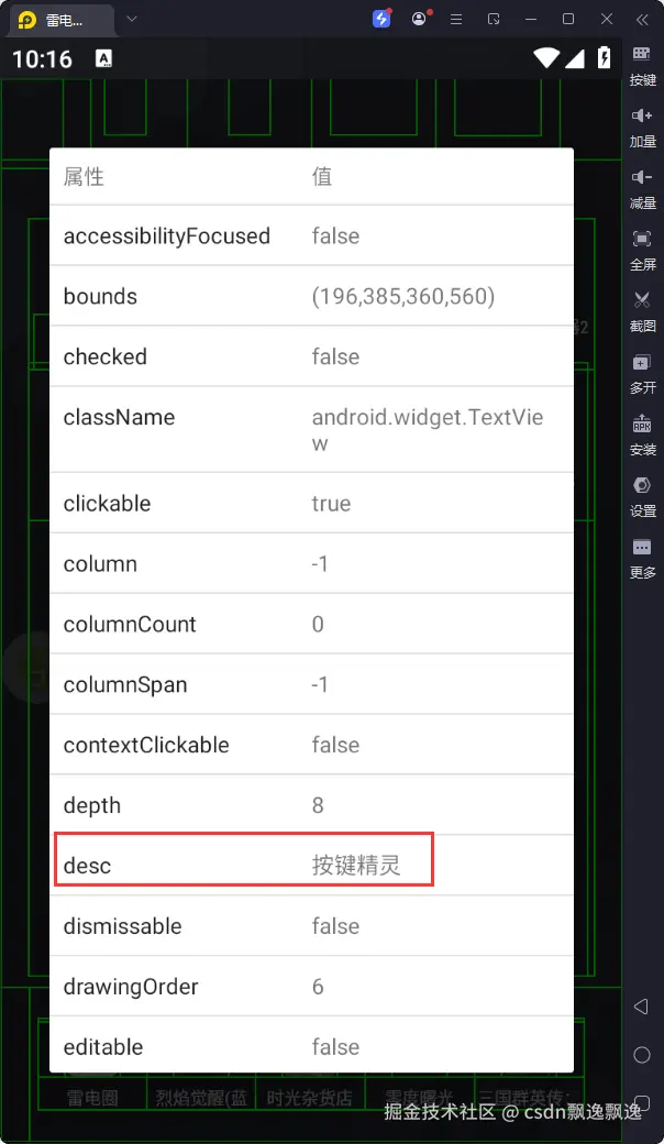 再提醒一下控件的问题,比如控件上显示不能点击,但是你调用点击函数也能操作成功。再比如空间上显示能点击,但是你调用点击函数不生效。你不用慌张,这个都是控件常规问题,可以在不影响点击区域的前提下,去点击它的父控件或者子控件,你发现就可以了,再不行就多嵌套几次,实在不行就用图像处理。也不用担心,这都是小概率出现的问题,我只是提醒下。
