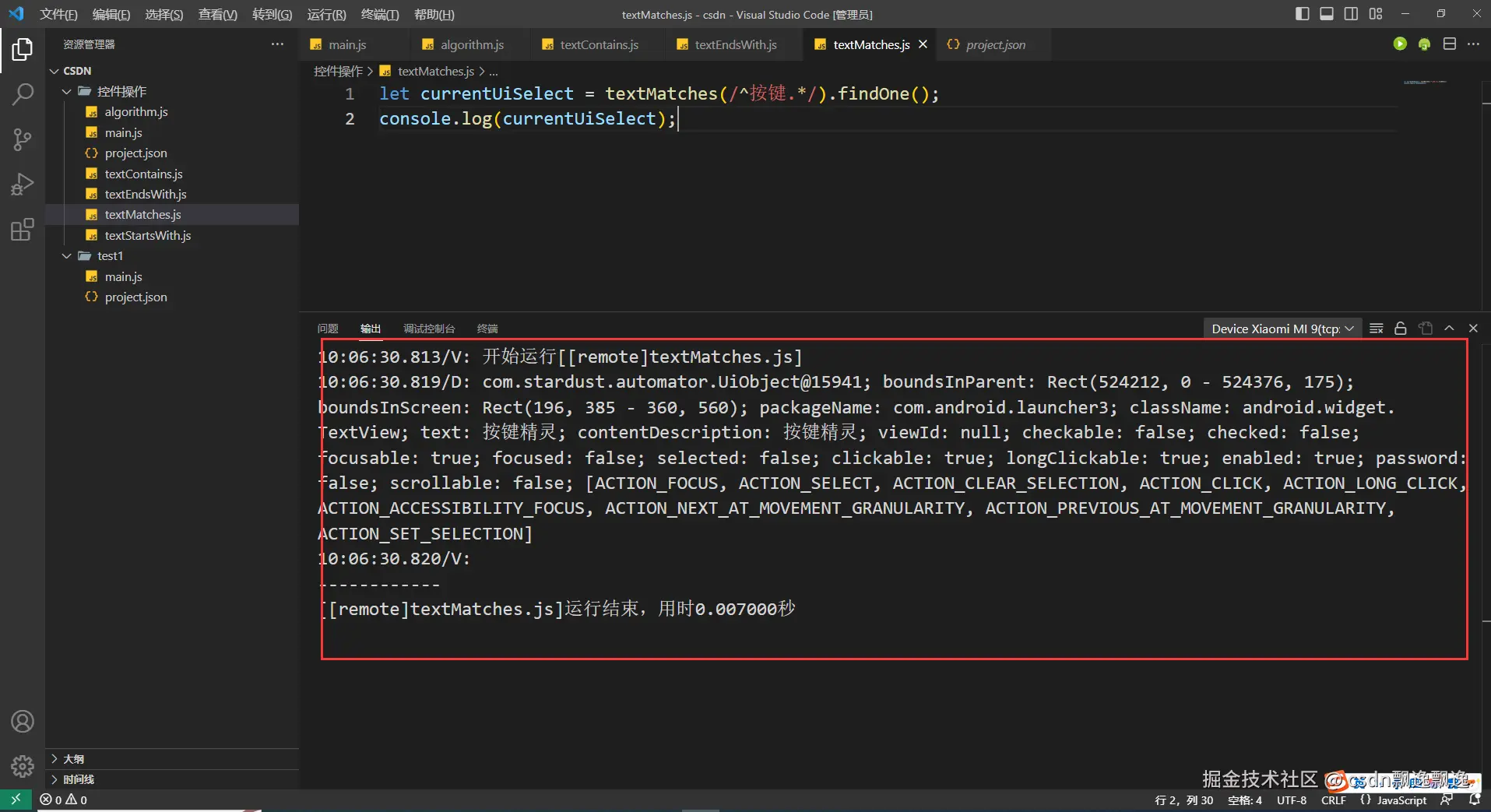 对应控件信息中的text内容,参数类型为字符串,用于获取text字符串匹配参数正则表达式的控件。正则表达式一般用于匹配规则非常复杂的字符串检索。在写脚本过程中,控件信息的text内容完全相同的情况很少,哪怕出现了,我们可以检索控件信息其他部分的内容,而不是写复杂的正则表达式。当然,如果有小伙伴确实想学习正则表达式,可以看我主页文章,有关于正则表达式内容介绍。如果能够成功理解正则表达式的内容,完全可以使用这个一个函数完成text内容的匹配,没有必要使用前面介绍的函数。比如:我通过正则表达式完成了与textStartsWith类似的查找方式。
