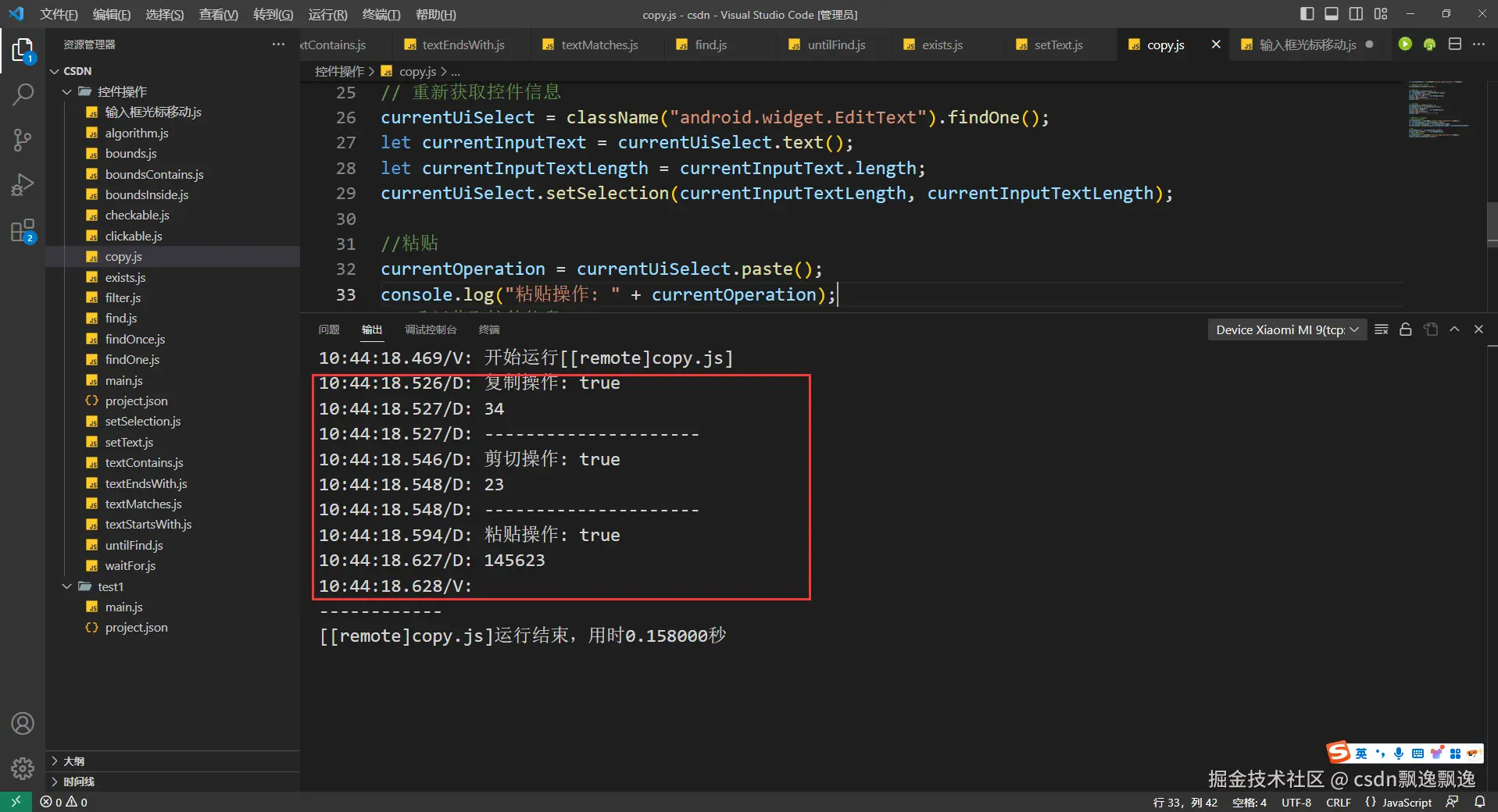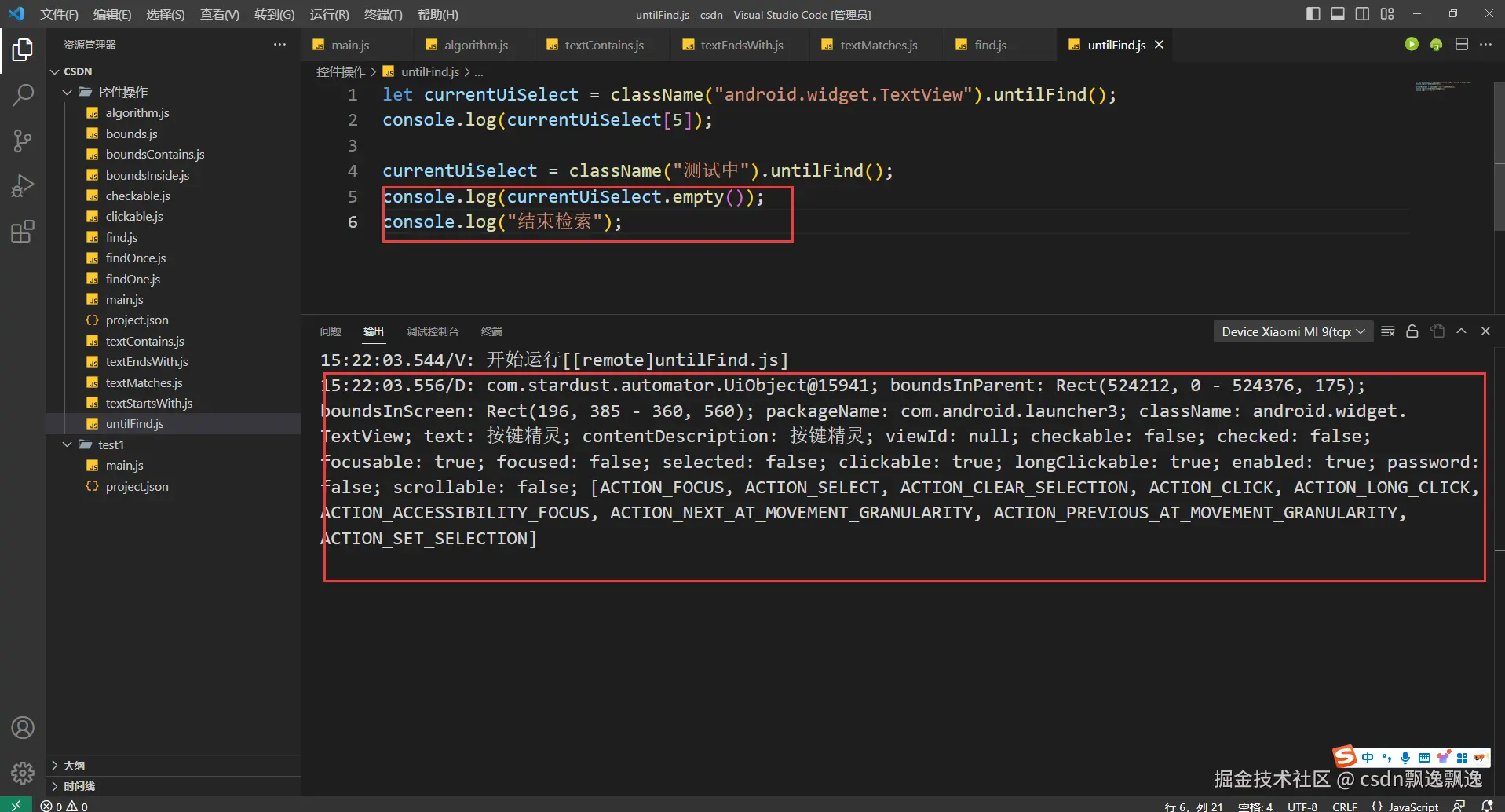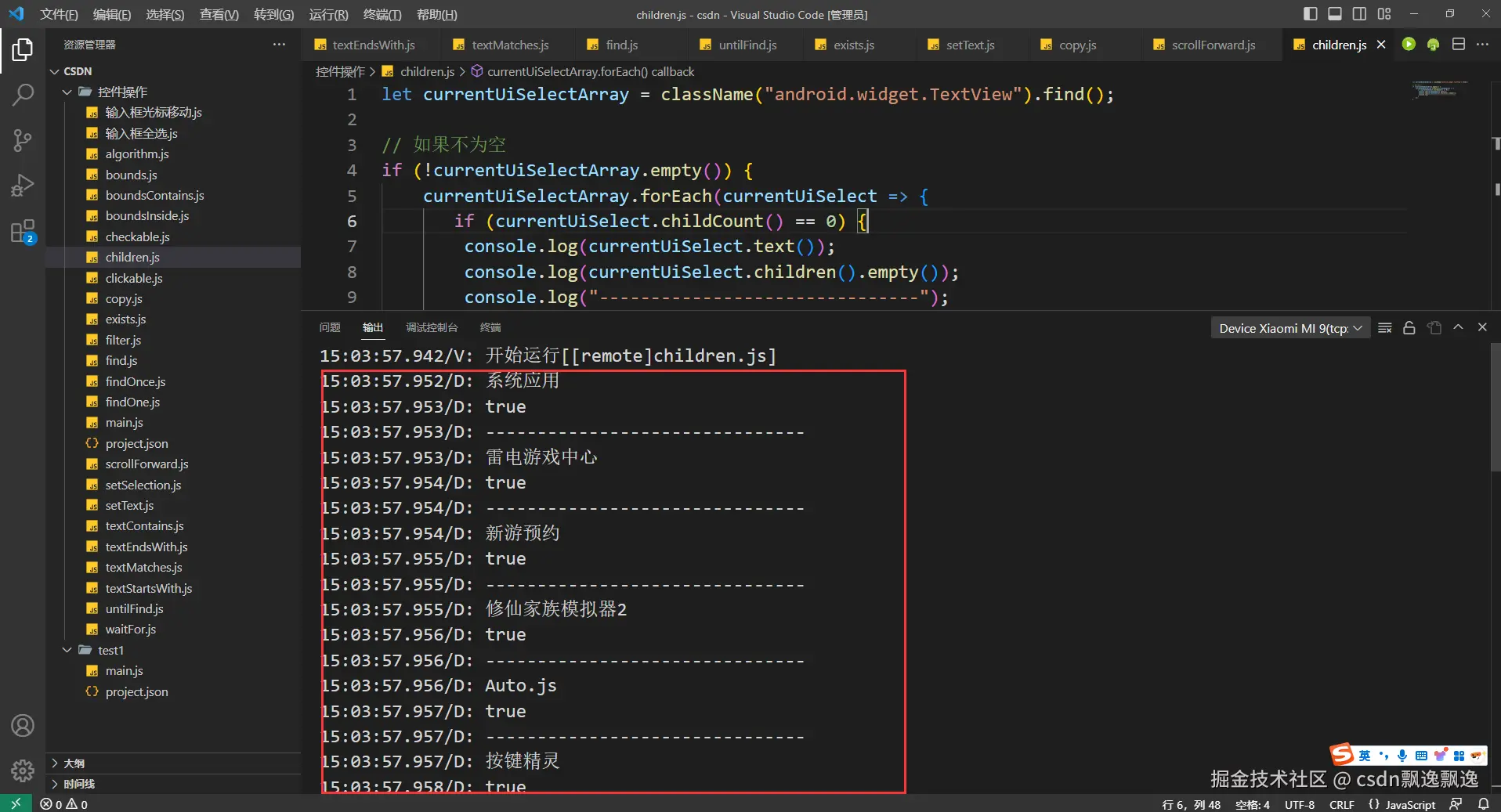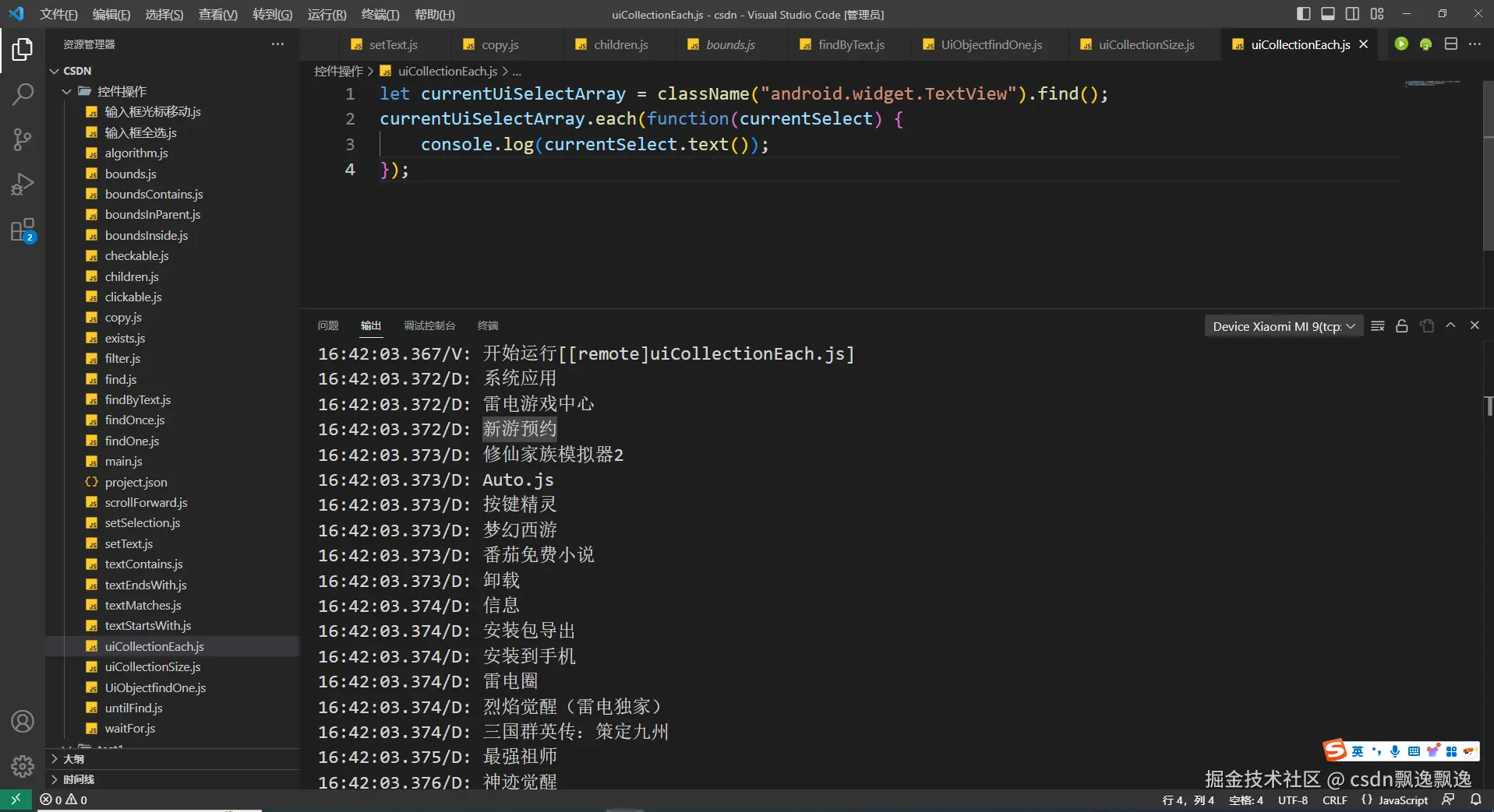 3.通过上面介绍,我们会发现输入框操作太复杂了。其实,这样操作完全是为了更全面地学习autojs内容罢了,为了在特殊情况下能够找到这个方向罢了。正常情况下,获取或者操作输入框时,几乎没人会使用这种方式。只需要记住,获取输入框的内容,只需要调用控件的text函数(这个函数后面会介绍)即可,一下获取输入框的所有内容,具体我们最后需要获取哪个部分字符,再通过js字符串函数操作呗,最起码比选中和移动光标方便多了;操作输入框内容时,只需要记住调用序号2的setText方式即可,我们通过js获取到最终字符串,然后通过这个函数赋值,会通过新值覆盖掉原来的值。