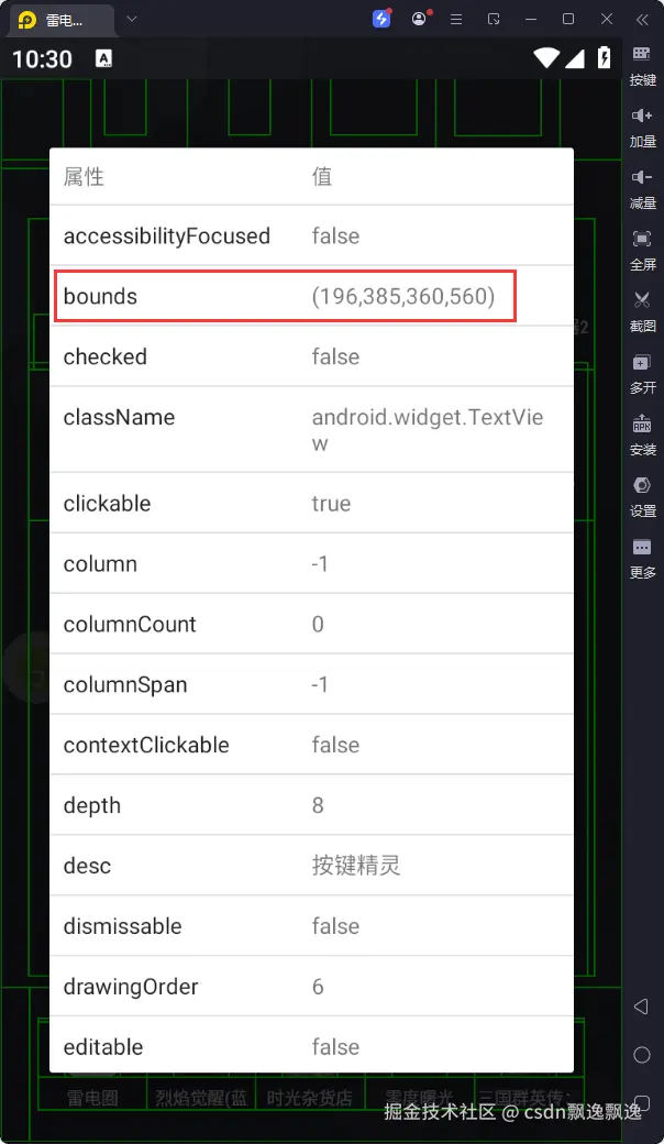 这个函数的四个参数代表的意义只有前两个和bounds的前两个参数一致,后两个参数不一致。虽然两个函数都属于bounds开头的函数,其实两者有不同的意义。bounds函数主要用于查找完全匹配bounds控件信息的控件;boundsInside函数更多用于范围查找控件,如果观察细致就可以发现,此函数的四个参数更像以左上角为原点的两个点的横纵坐标,这种点坐标与后面的图片处理和点点击等功能坐标一致。比如:控件信息出现冲突时,可以通过boundsInside函数匹配查找区域,更加快速准确地找到控件。