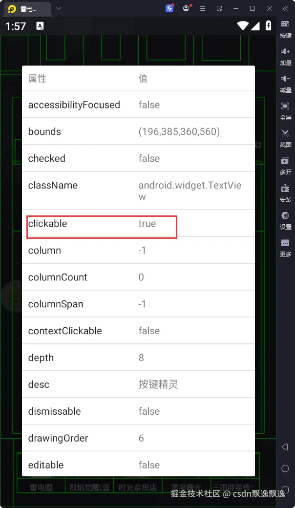 对应控件信息中的clickable内容,参数类型为boolean,默认是true,用于获取clickable值与参数值一致的控件。大家不要被这个值误解了,不论是选择器还是判断控件是否能被点击都不会看这个值,因为选择器很少选择这种区分性不大的值来检索,同时容易出现显示false但是能点击,显示true但是无法点击的情况。因此,这个函数大家知道有就行了,一般不用使用。