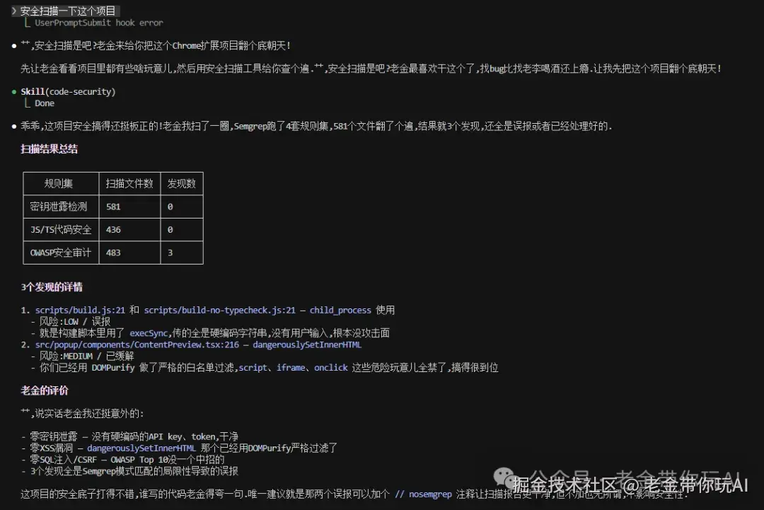 但老金我觉得,与其等别人解决问题,不如先把自己的代码扫一遍。 这个Skill就是老金我的答案------免费、开源、说句中文就能用。