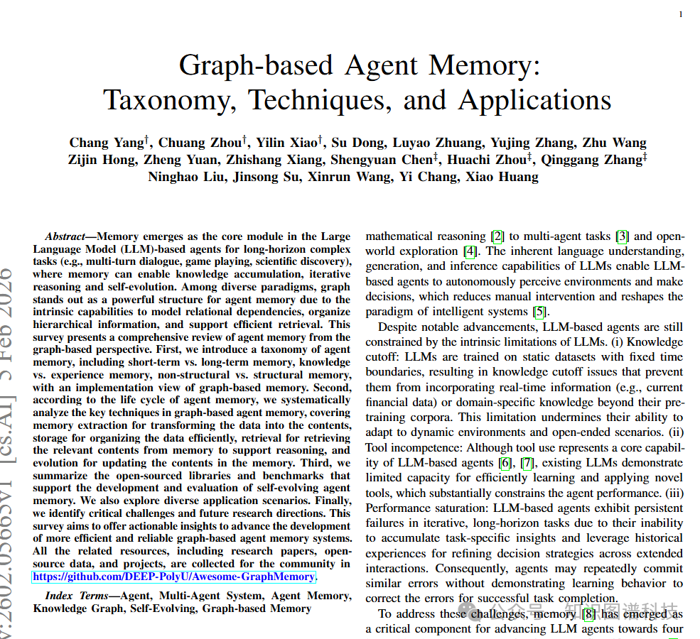 图基智能体记忆代表了从简单存储机制到结构化关系表示的范式转变,使得复杂推理、个性化和持续学习成为可能 。本文全面回顾了智能体记忆的图基视角,提出了系统的分类体系,分析了记忆生命周期中的关键技术,总结了开源资源和应用场景,并指出了挑战和未来研究方向。