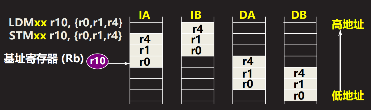 - 栈操作指令类似于多寄存器加载存储指令