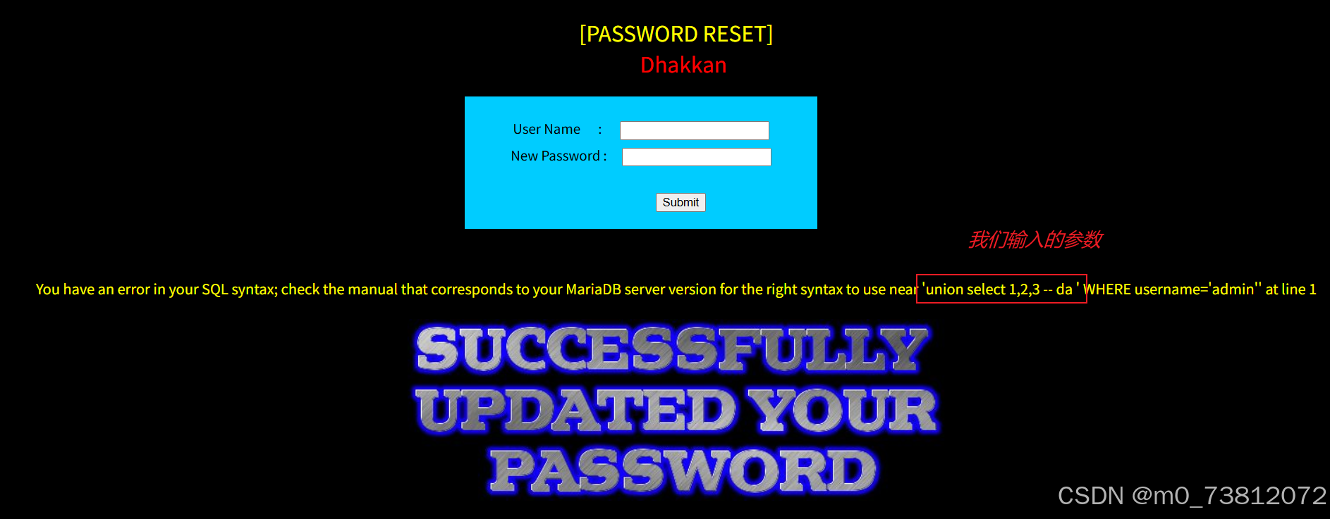 ?id=-1' union select 1,2,3 -- da作为密码时,SQL 变成了:- UPDATE users SET password = '?id=-1' union select 1,2,3 -- da' WHERE username='admin'