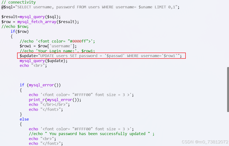 $update参数中,密码passwd必须在username存在的前提下设置;(也就是不能随便输入) - 然后在密码处进行注入;