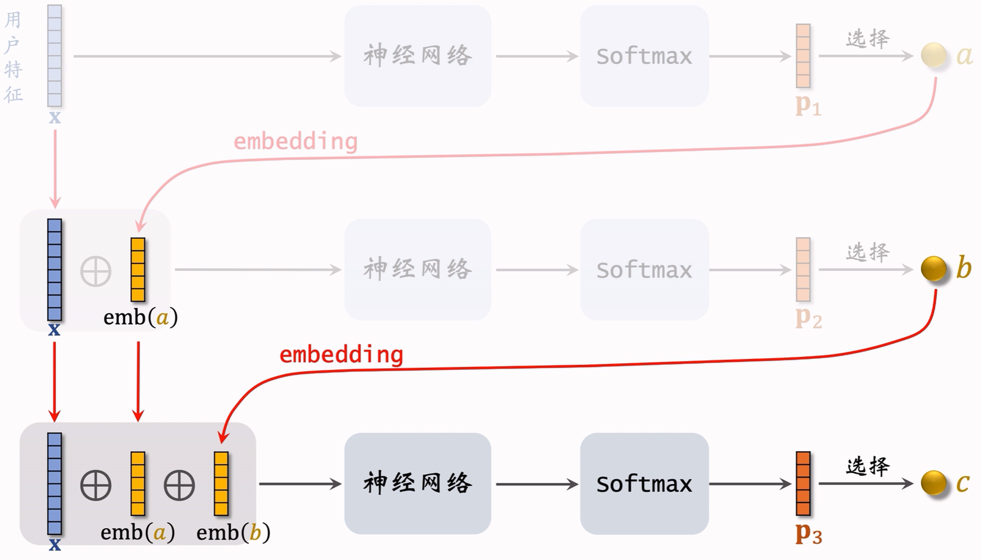 - 给定 x , a , b x,a,b x,a,b,预估用户对节点 c c c的兴趣 p 3 ( c ∣ a , b ; x ) p_3(c|a,b;x) p3(c∣a,b;x)。