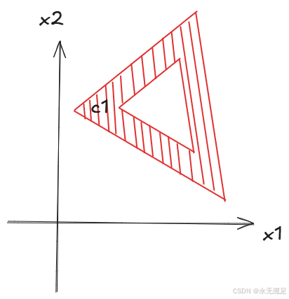 如图:假如有一个分类问题用以下三角形决策面进行分类,假设在决策面里面的为一类,三角形外面为另一类。