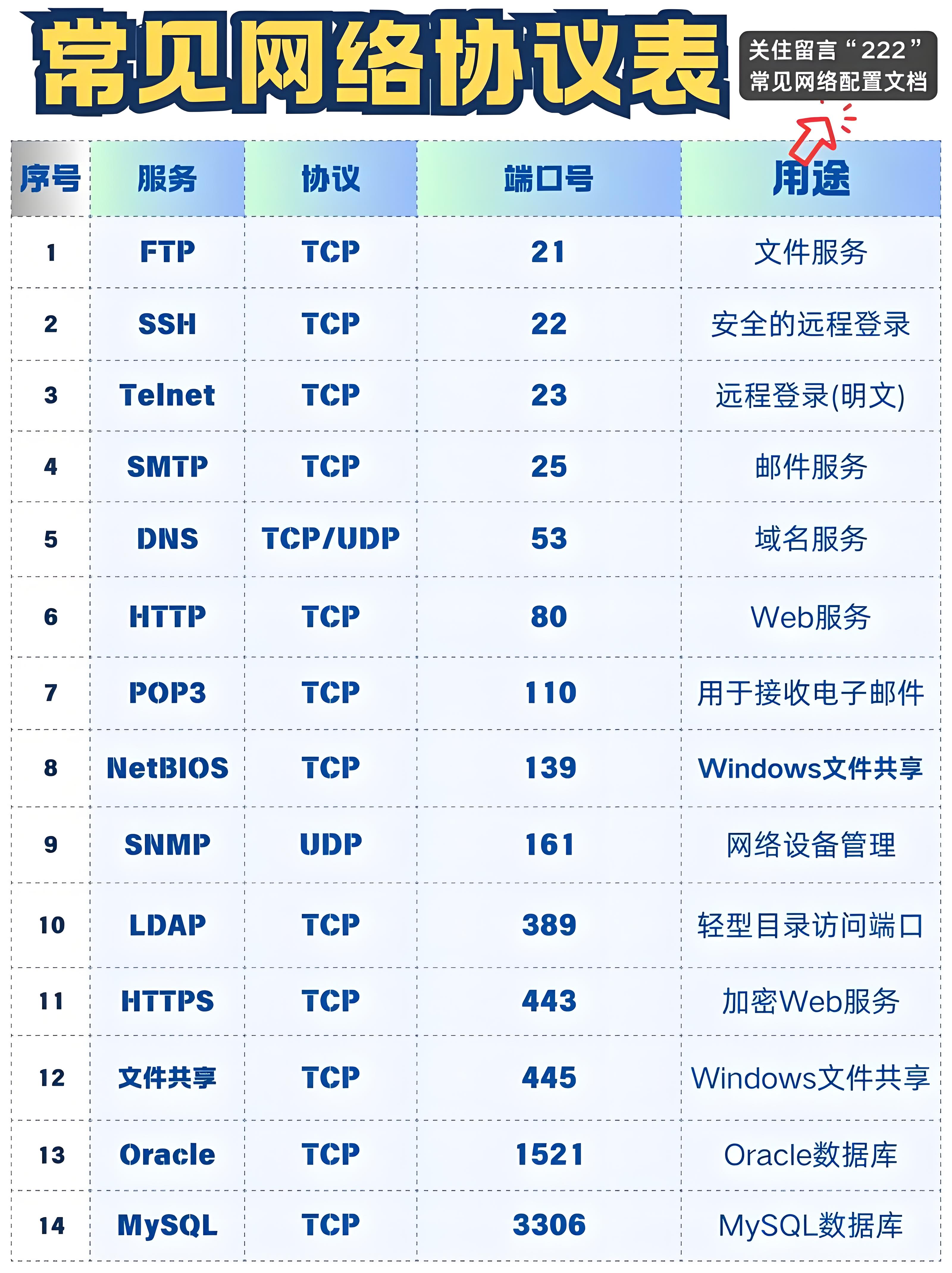 保存网络服务名和它们所使用的协议以及端口号。文件中的每一行对应一种服务,它由4个字段组成,分别表示"协议名称","端口号"、"传输层协议"。Linux系统在运行某些服务时会用到该文件,一般不需要修改该文件的内容。