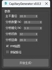 CapillaryGenerator插件参数间相互关联制约,例如分枝的长度,不仅受"分枝段数"参数影响,如"分枝锥化"、路径长度等都会影响分枝的长度,需要多做尝试,以便更好了解参数之间的这种关系。