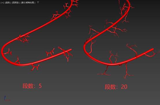 "分枝段数"参数用于控制分枝的平滑和分枝的长度,段数越多分枝越长。如图: