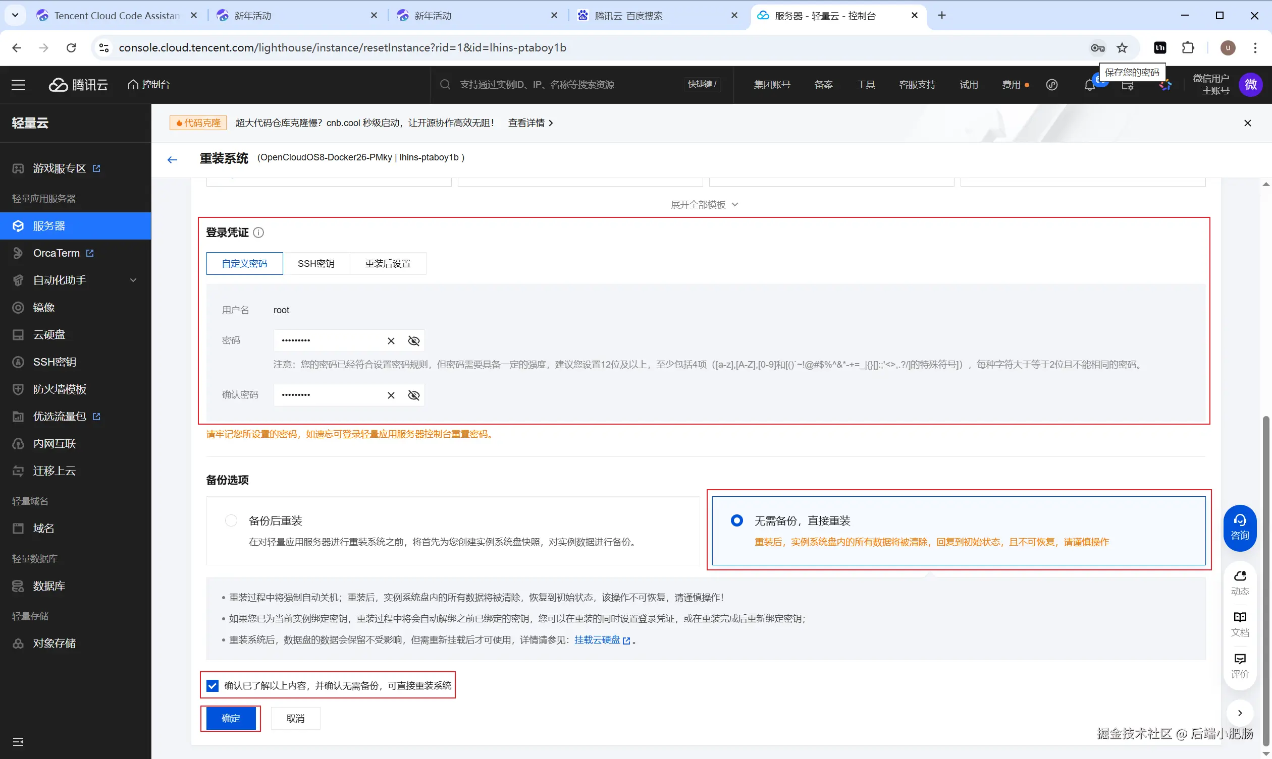 在登录凭证栏中选择【自定义密码】输入密码和确认密码,备份选项栏选择【无需备份,直接重装】,点击底部【确定】按钮。