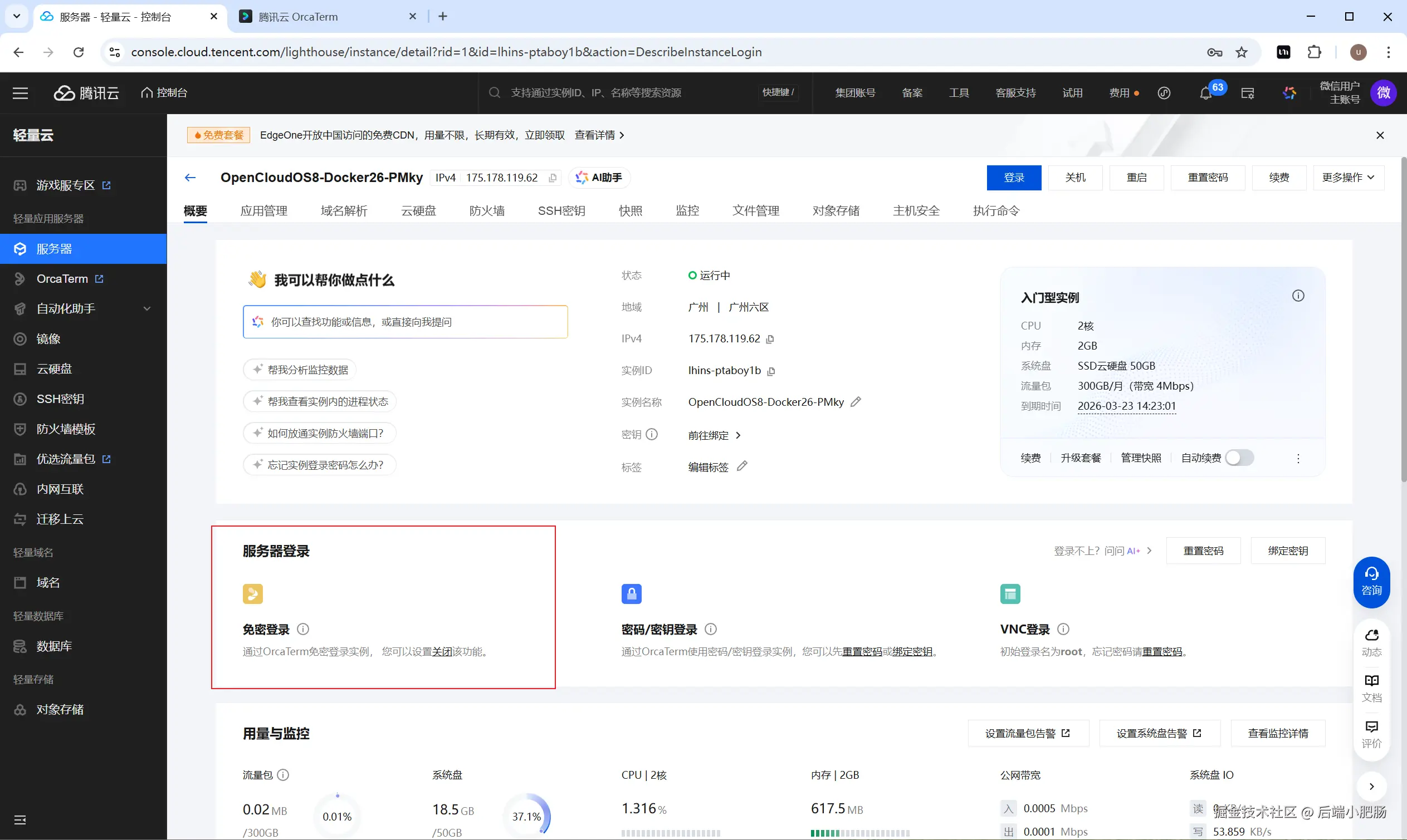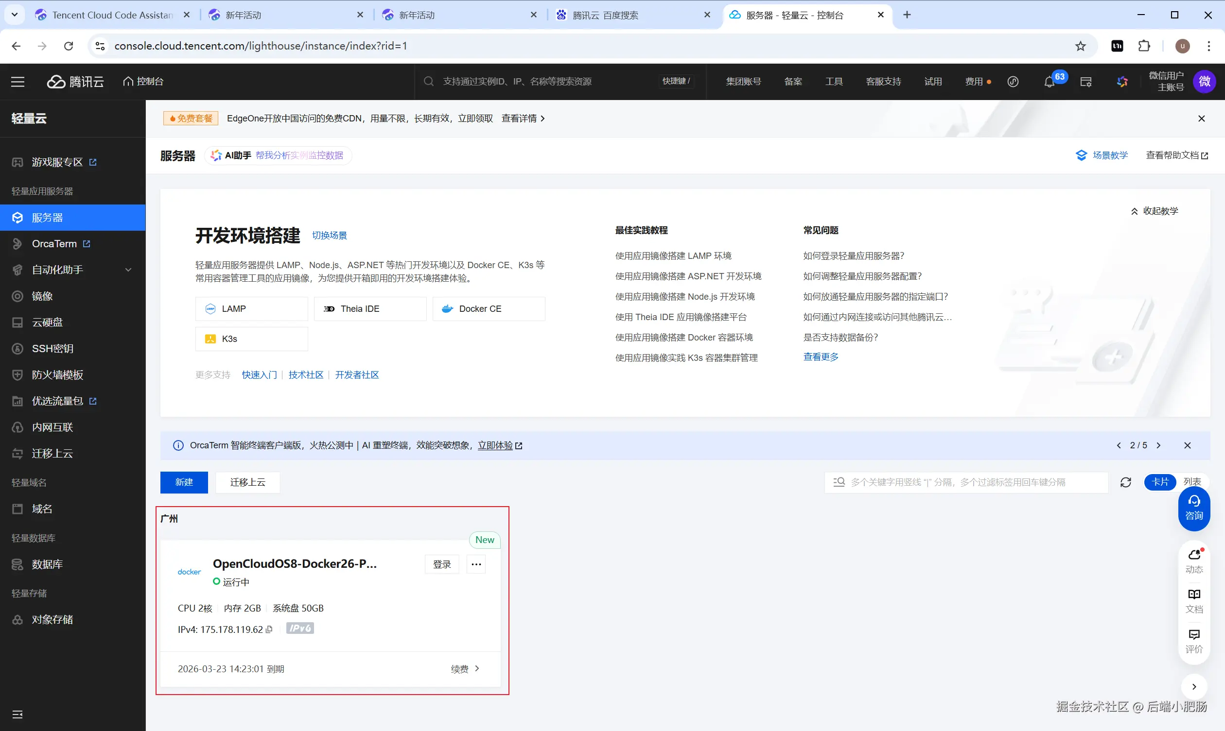 现在我们来到了云服务管理页面,可以看到这台服务器就是我们刚刚免费领取到的。