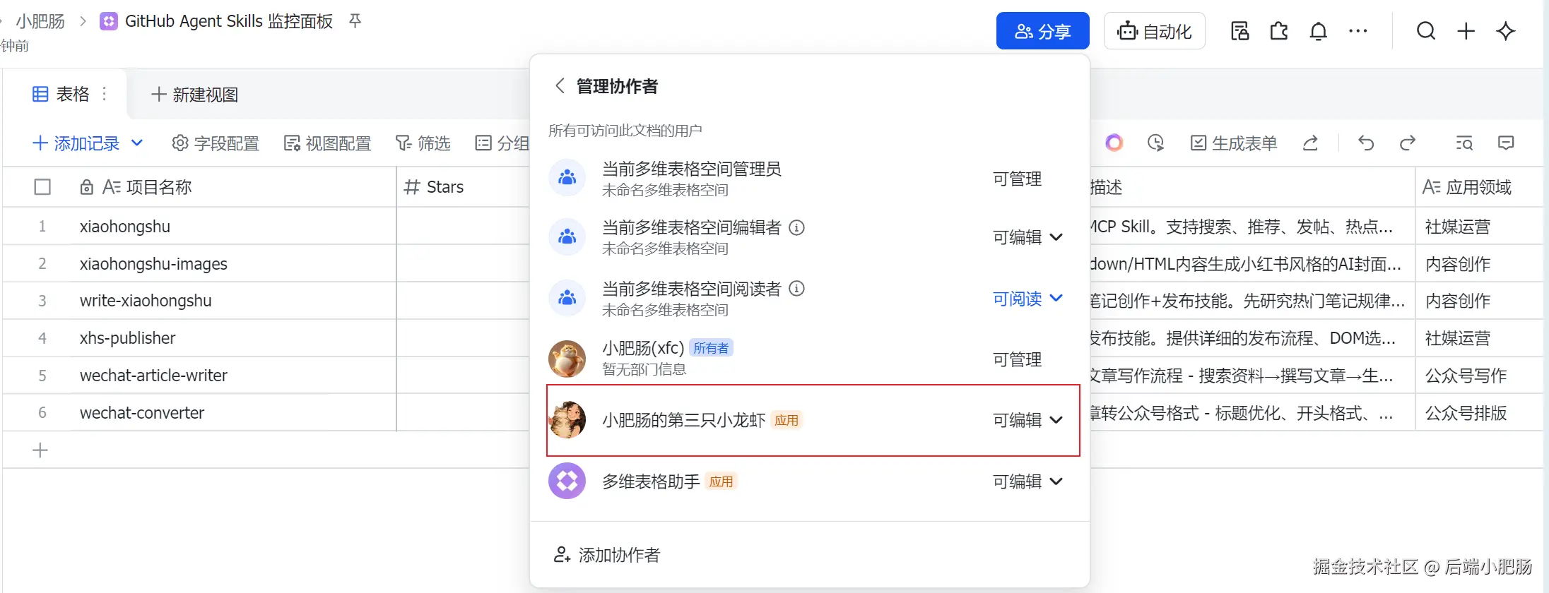 - 在飞书多维表格中把应用添加为可编辑权限