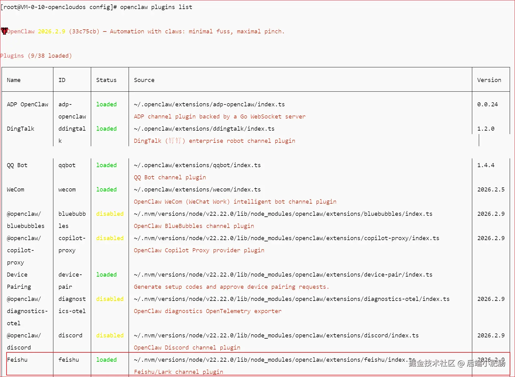 回到服务器命令行面板,按住ctrl+c退出长链接,输入OpenClaw plugins list可以看到飞书插件可用,如果是disable需要输入OpenClaw plugins enable feishu命令。