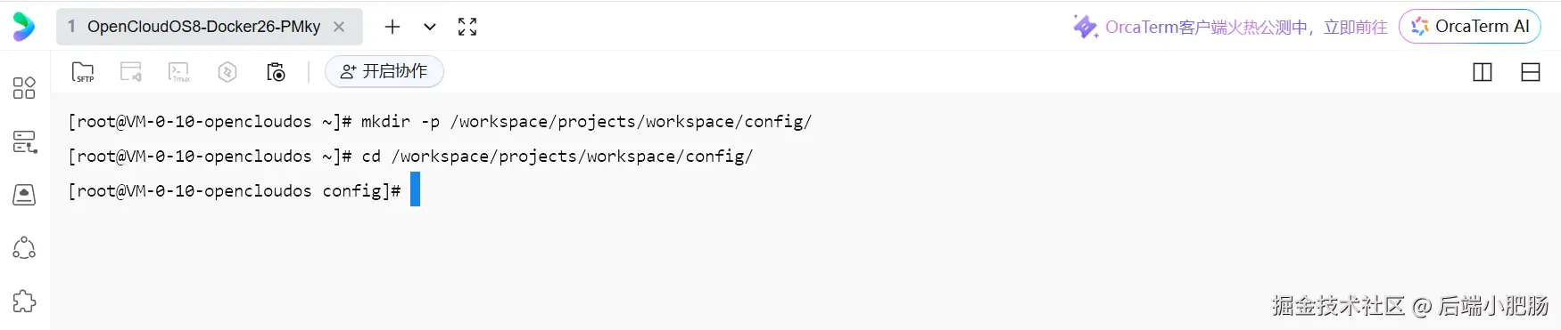 现在跳转到了服务器命令行面板,输入命令mkdir -p /workspace/projects/workspace/config/和cd /workspace/projects/workspace/config/