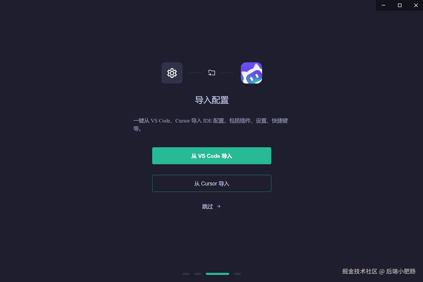 选择语言和主题(浅色或深色)点击 【继续】 进行下一步。在导入配置处如果你希望CodeBuddy 继承VS Code 或Cursor 的配置可以任选其一进行导入,也可以点击底部 【跳过】 按钮跳过这个步骤。