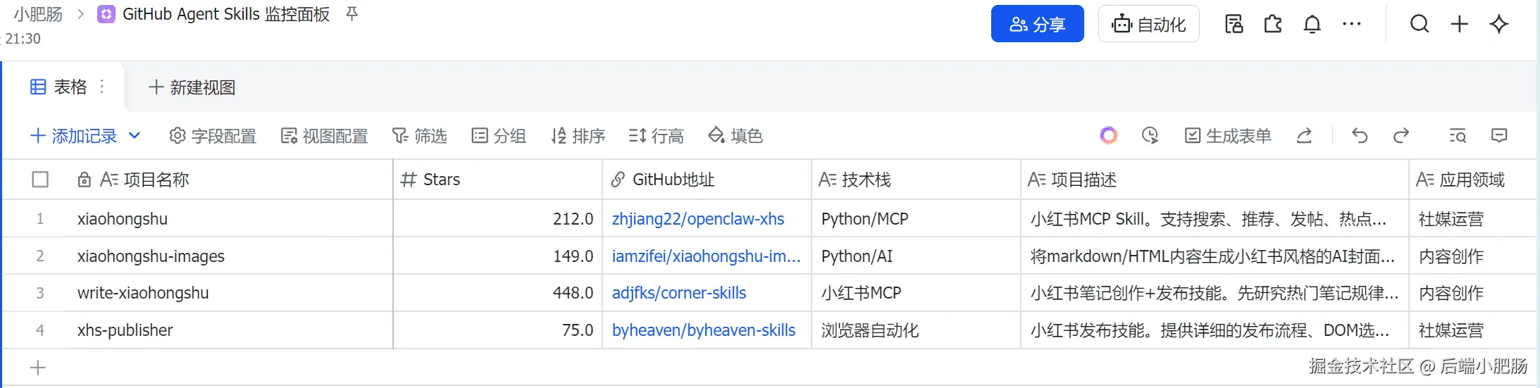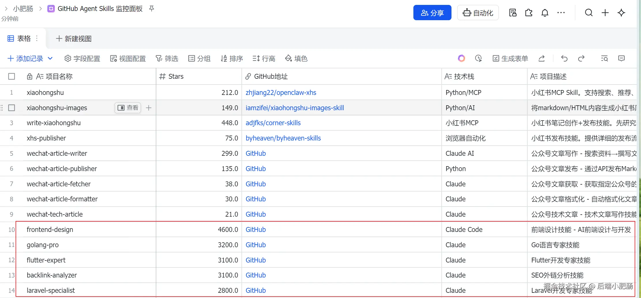 - 创建飞书空多维表格。可以自己建或者让OpenClaw建,也可以直接用我的模板GitHub Agent Skills 监控面板
