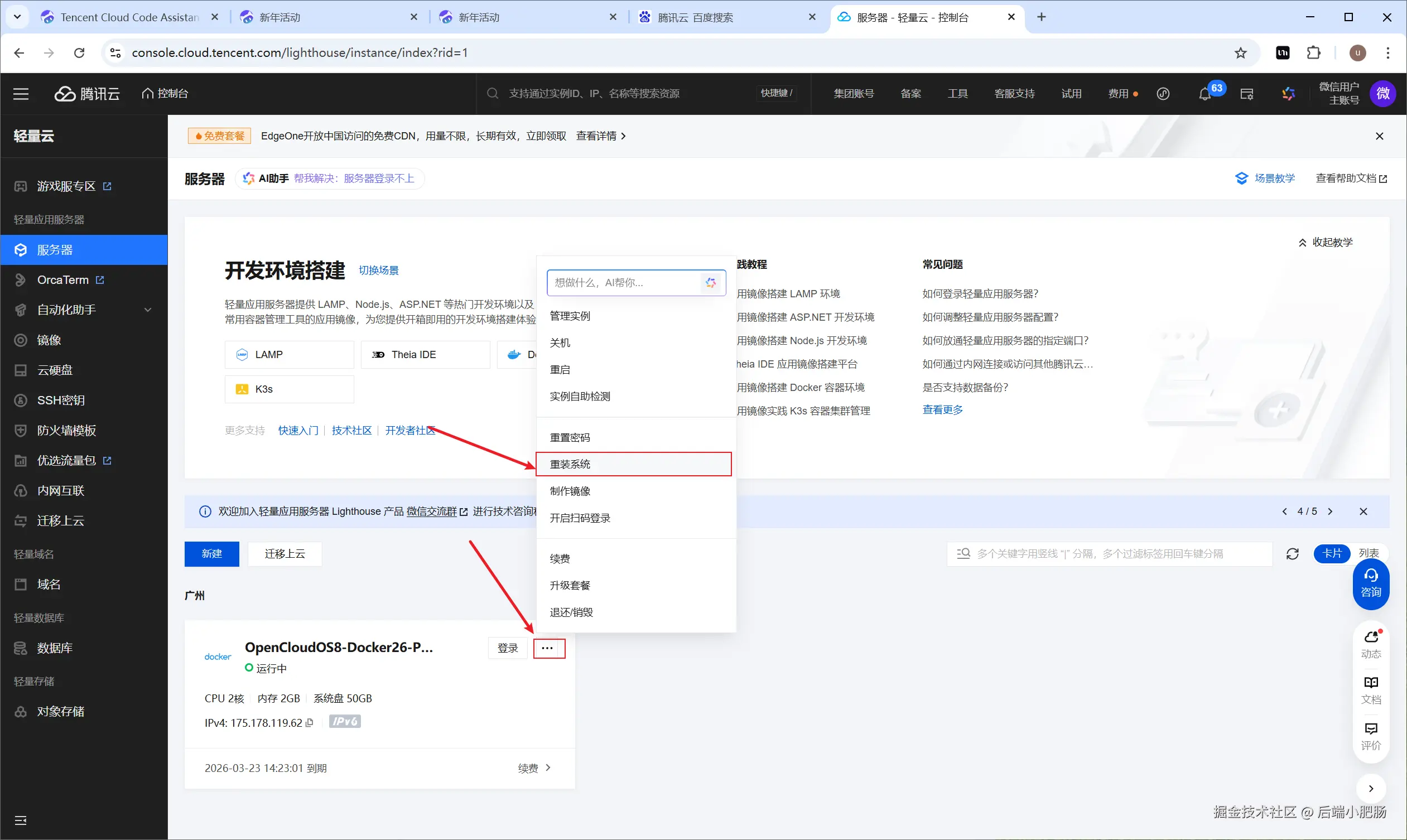 点击服务器详情里的三个横点,在弹开的菜单中选择【重装系统】。