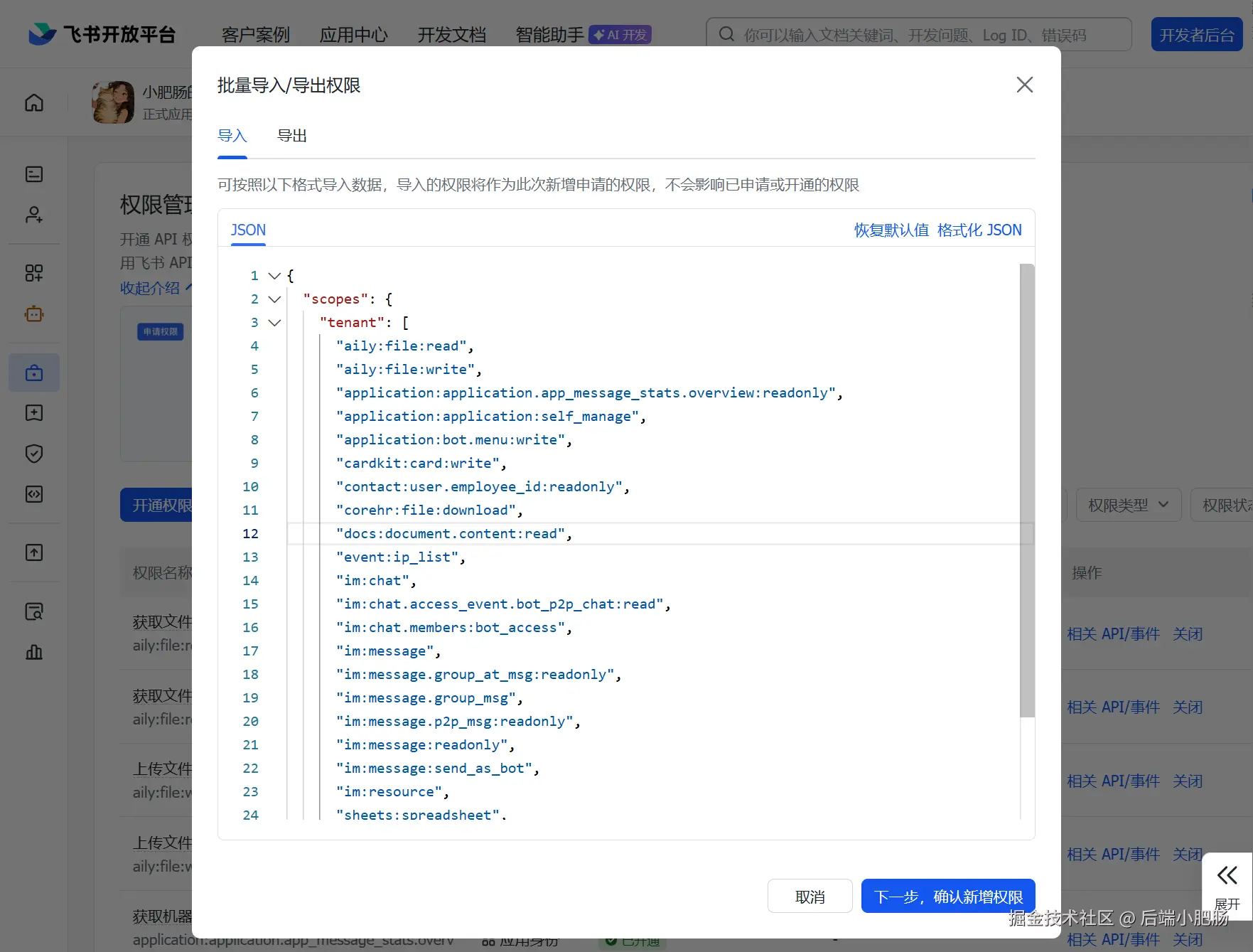 来到【权限管理】页面,点击【批量导入/导出权限】。填入以下json代码后点击【下一步,确认新增权限】。