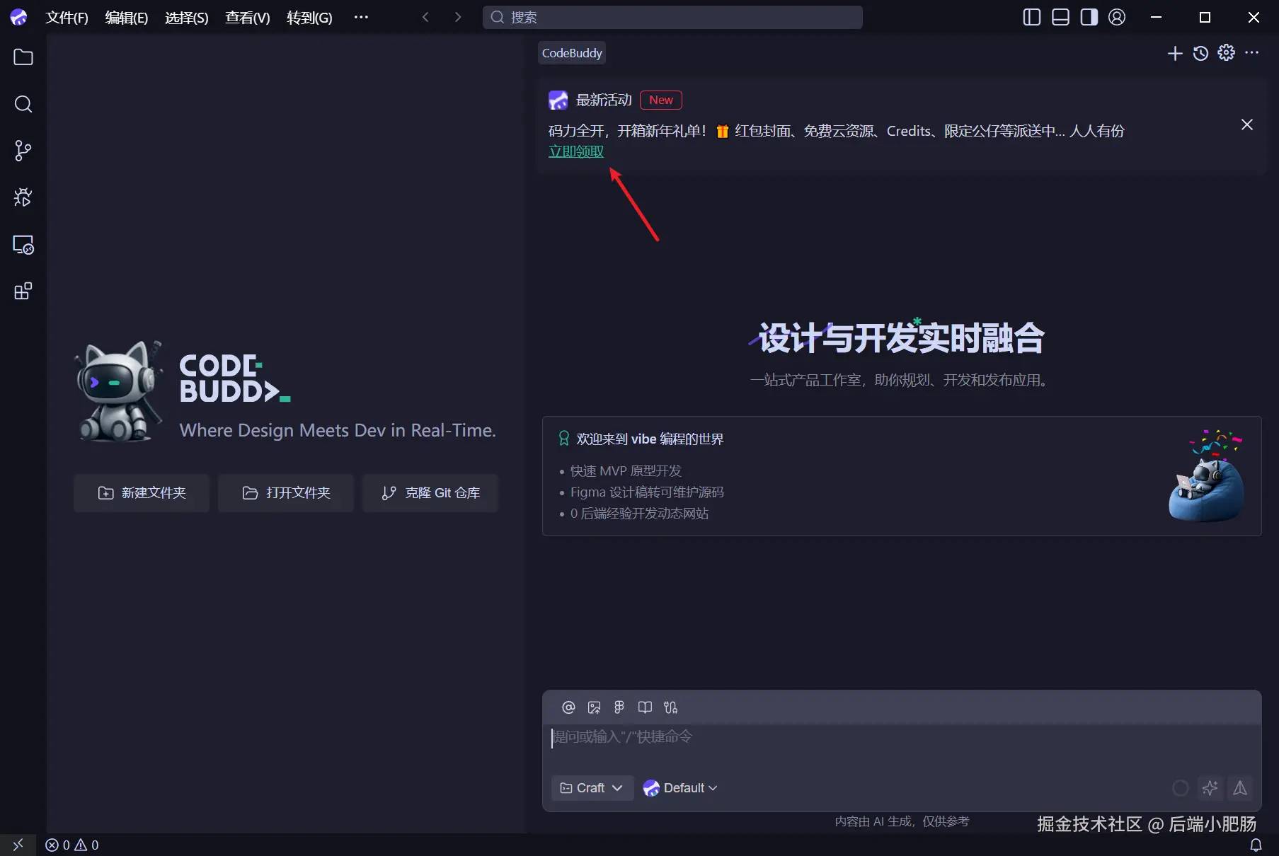 在CodeBuddy 软件的初始化界面有活动领取指引,点击 【立即领取】 跳转至浏览器界面。