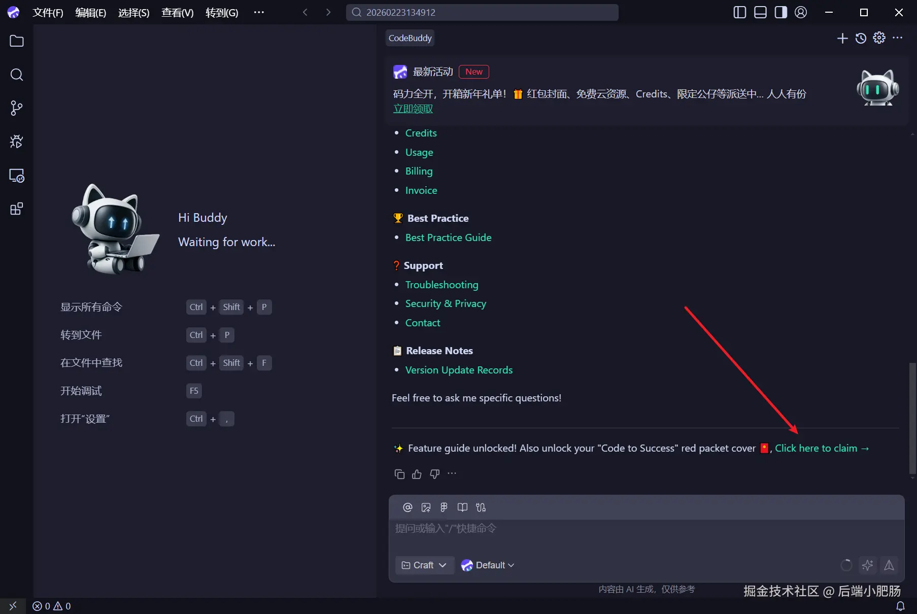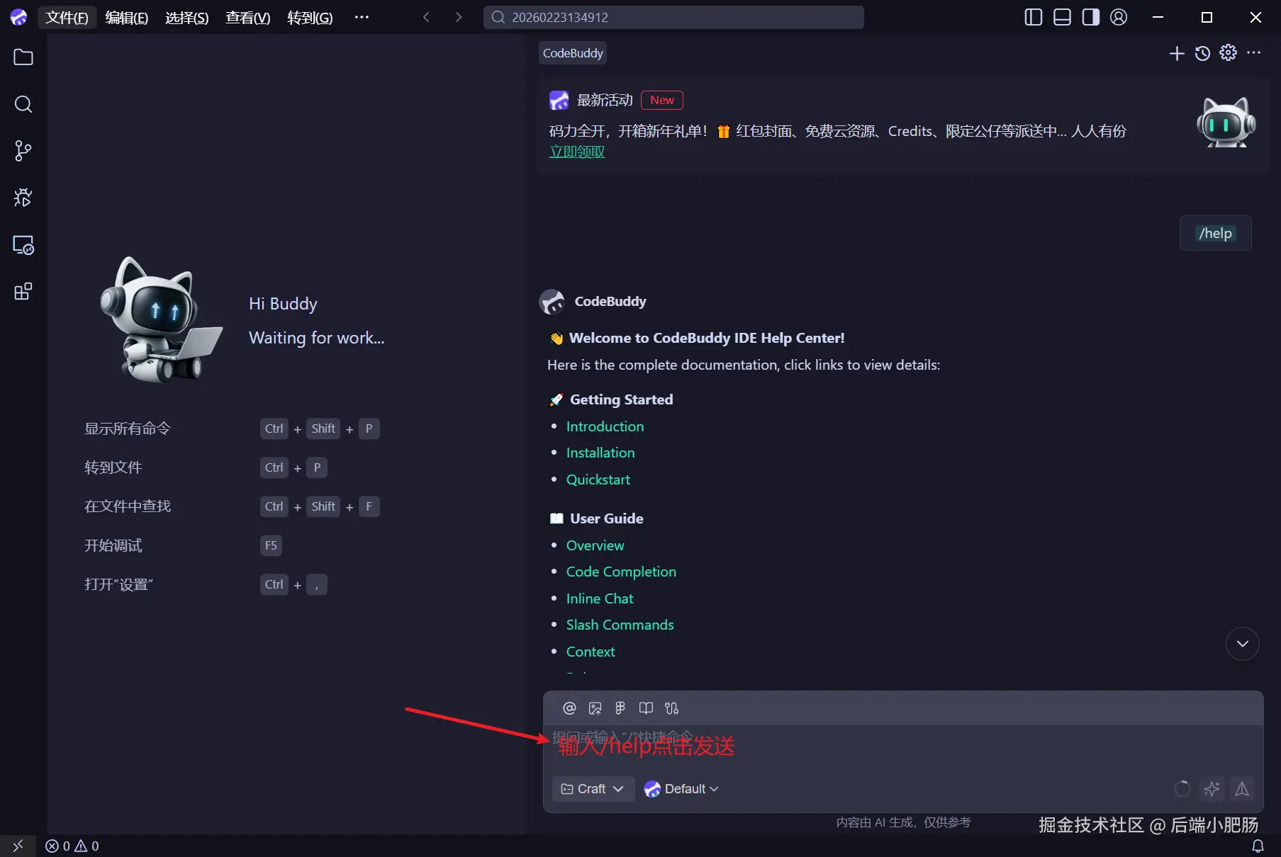 我们先把红包封面领了,它的领取条件的只要在CodeBuddy 对话框内发送/help指令就行。