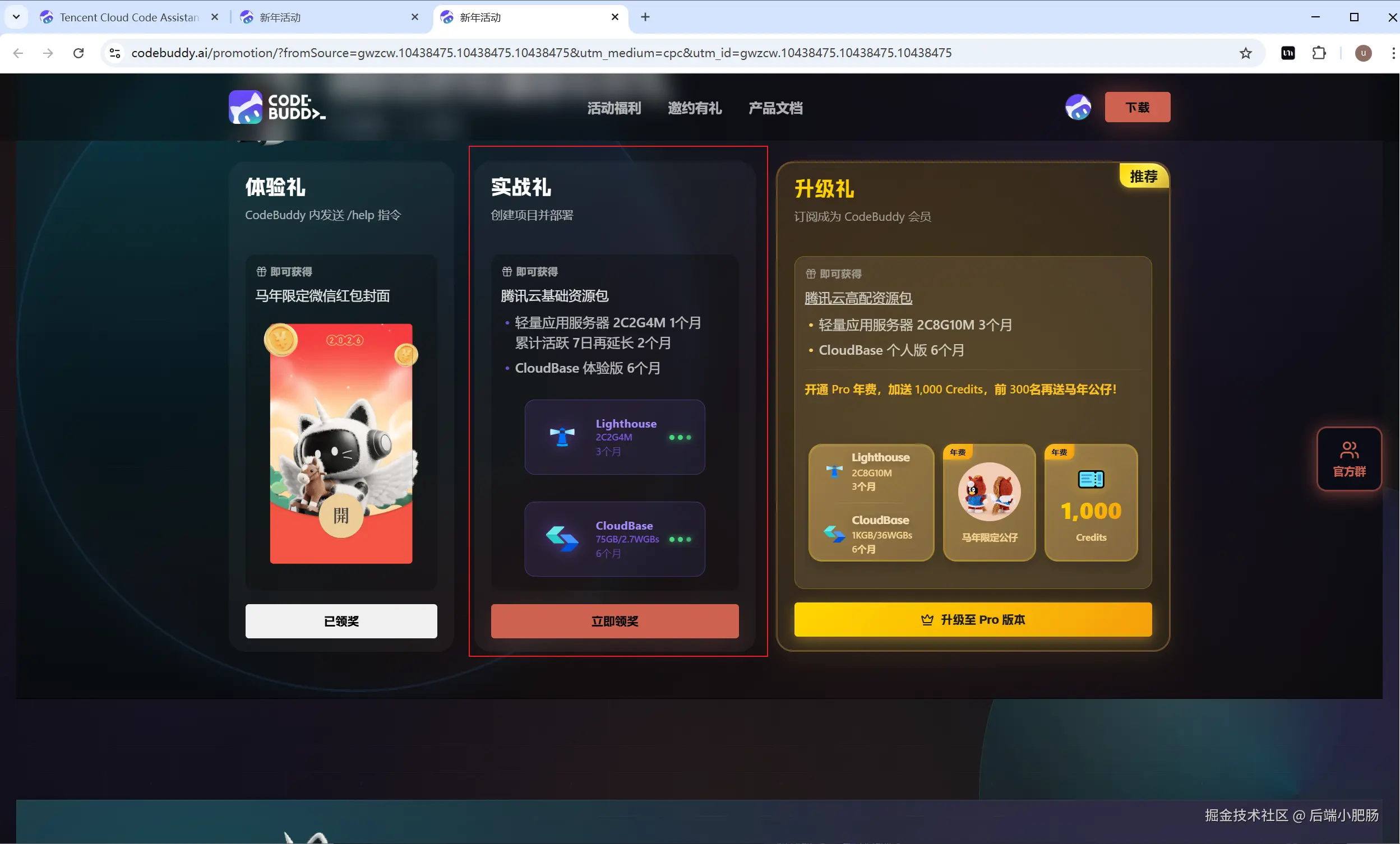 停留在浏览器界面,继续领取 【实战礼】 ,这个奖励是免费的云服务器资源(可使用一个月),点击 【立即领奖】。