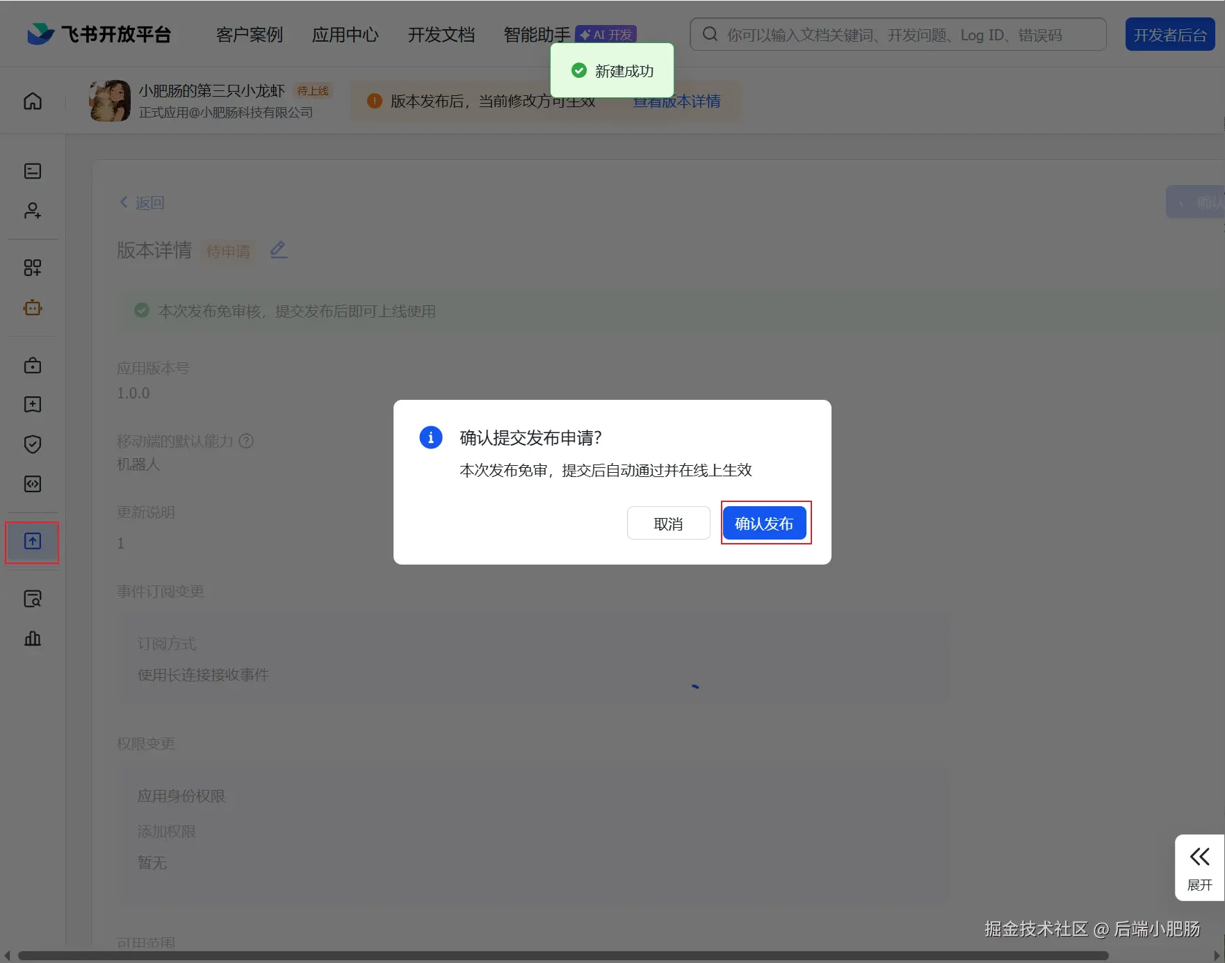 点击 【版本管理与发布】 发布应用,点击 【创建版本】 按钮,填写版本信息后提交审核并发布,重新进入 "小肥肠的第三只小龙虾" 会话界面,已经可以正常使用了。