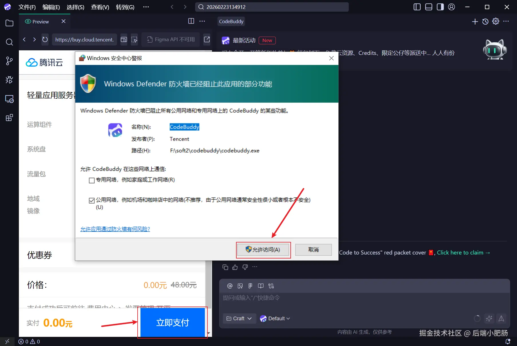 此刻弹出了windows安全中心警报弹窗 ,点击 【允许访问】 ,回到CodeBuddy软件 点击 【立即支付】 。