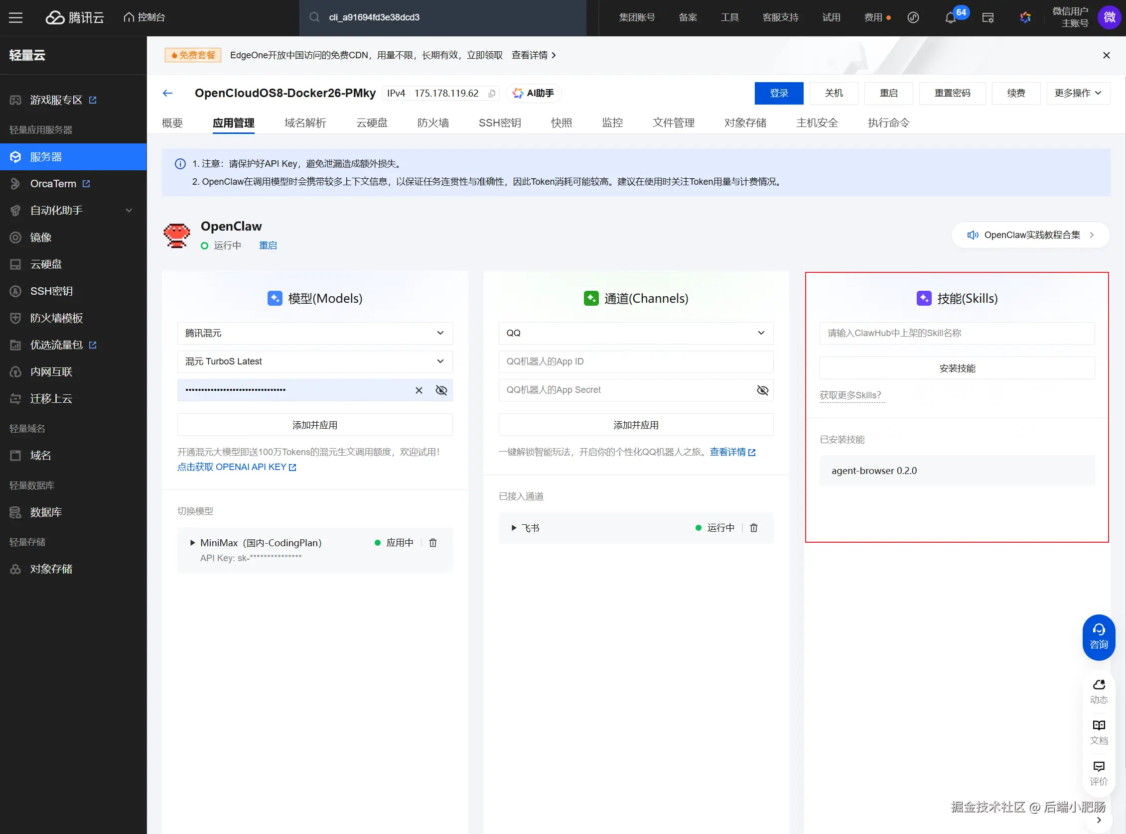 回到云服务器管理界面,点击 【应用管理】 ,点击输入技能名称(find-skills ),点击 【安装技能】 按钮。