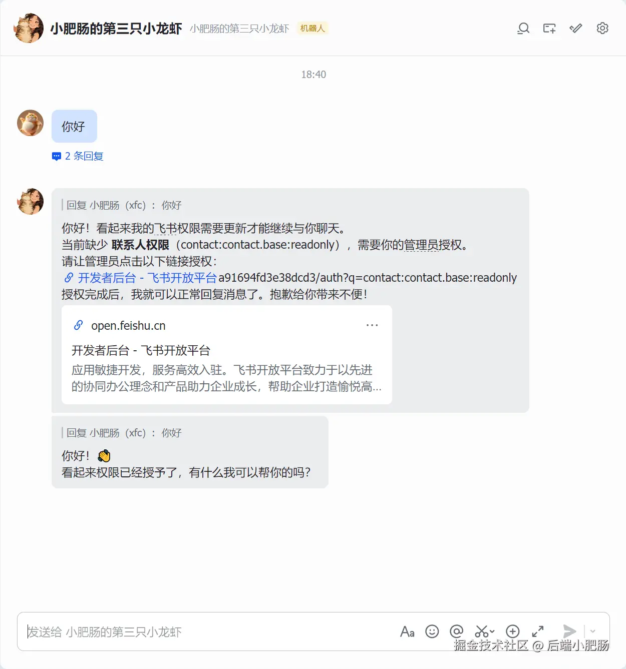 在飞书找到我们刚刚发布的应用 "小肥肠的第三只小龙虾" ,直接点击进入对话,第一次会话有点小问题,显示权限不足。